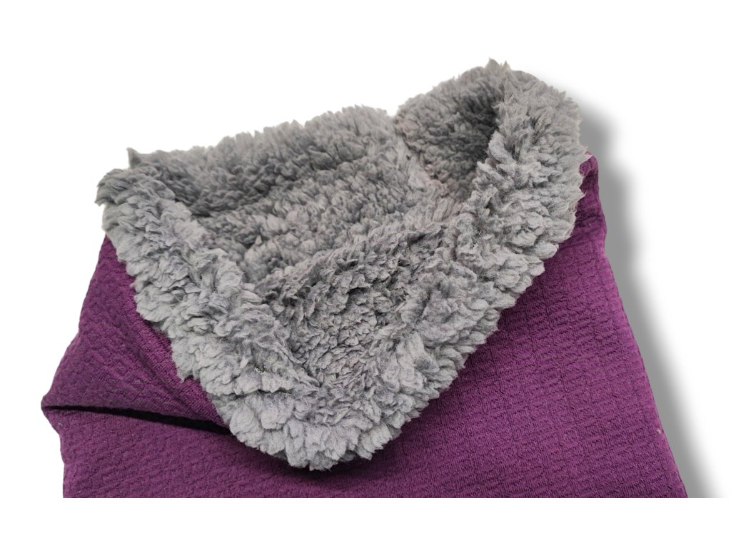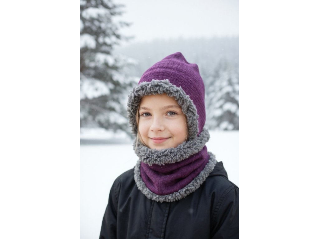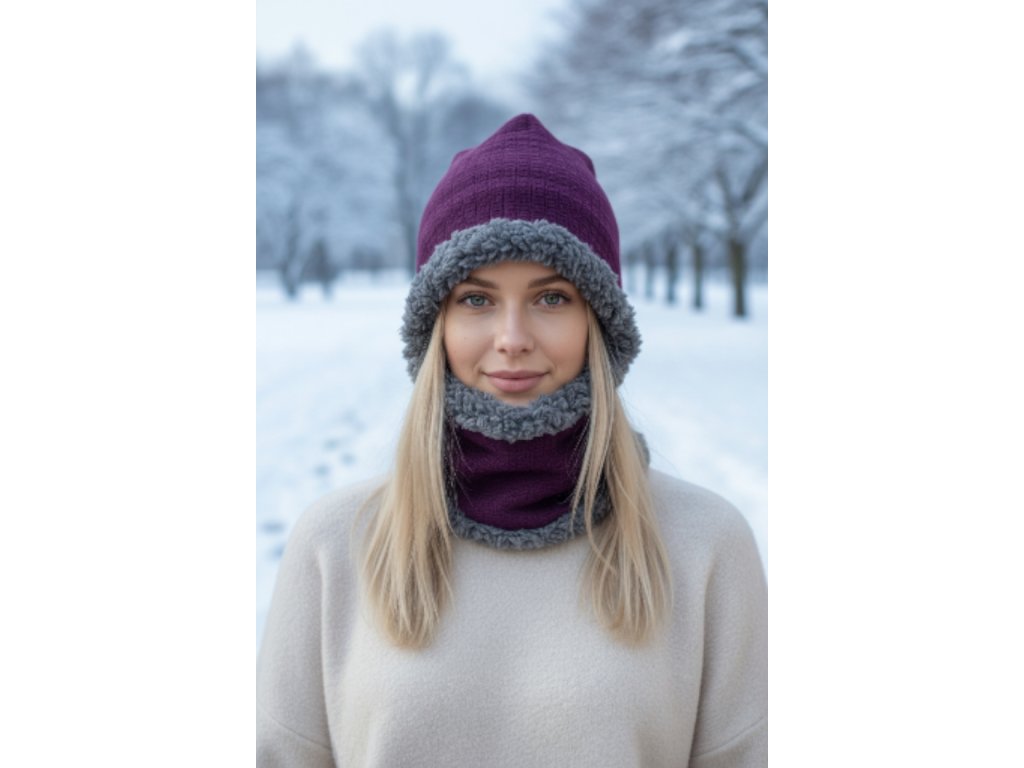 Set je ušitý z jednobarevného úpletu se strukturou. Jako podšívka je použitý hřejivý beránek v šedé barvě. Čepice může být klasická rovná nebo ušanka na zavazování. Nákrčník je tunel.