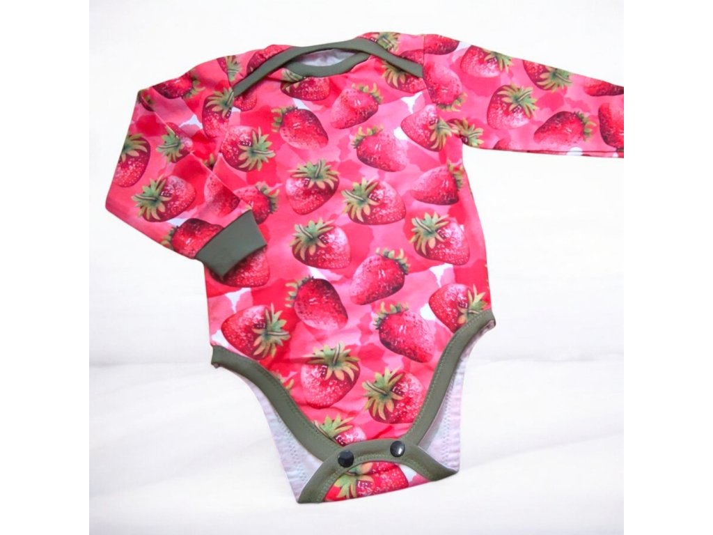 Body je ušité z potištěného úpletu s obrázkovým panelem. Je s dlouhým rukávem, obálkový výstřih pro lepší oblékání, zapínání na patentky.