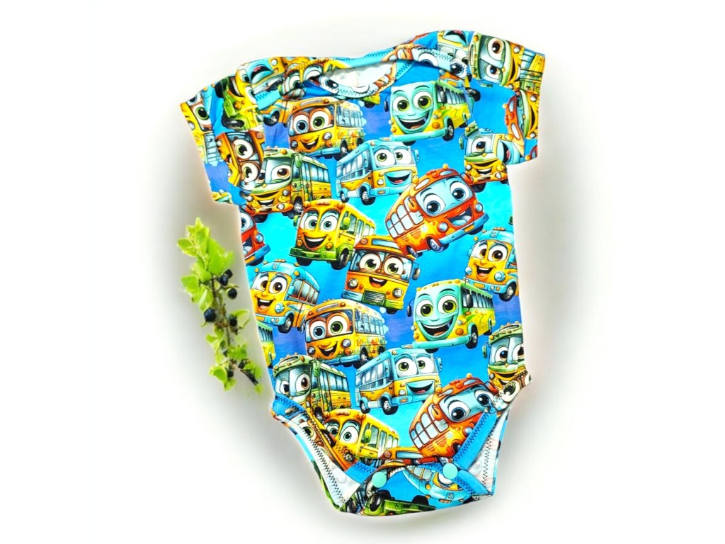 Ušito z potištěného úpletu, body je s krátkým rukávem, zapínání na dva patentky, obálkový výstřih pro lepší oblékání.