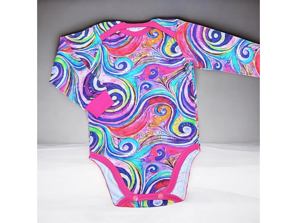 Body je ušité z potištěného úpletu s obrázkovým panelem. Je s dlouhým rukávem, obálkový výstřih pro lepší oblékání, zapínání na patentky.