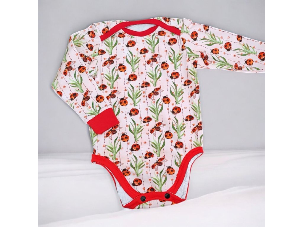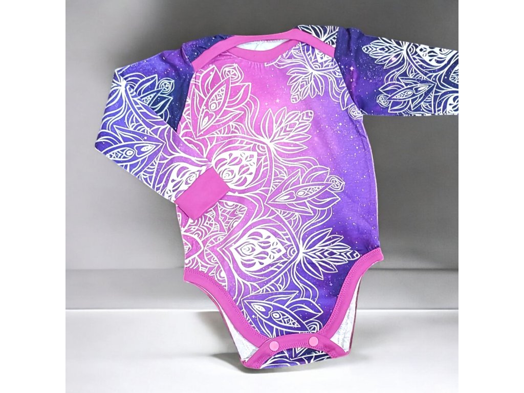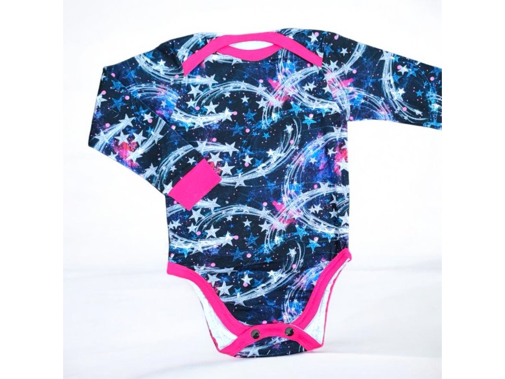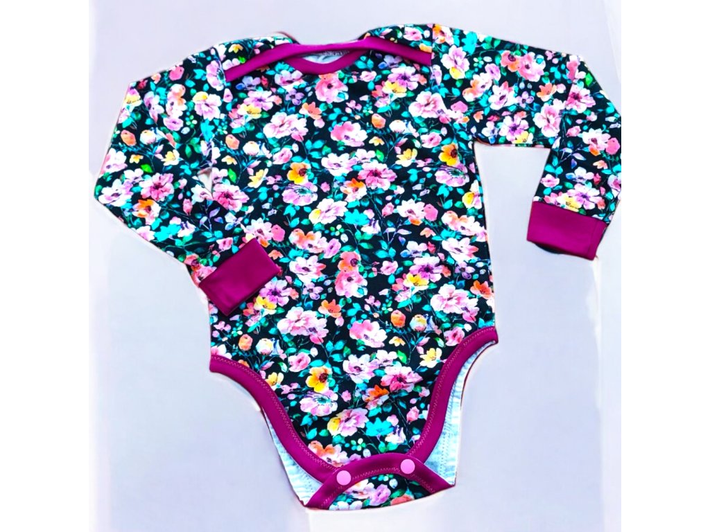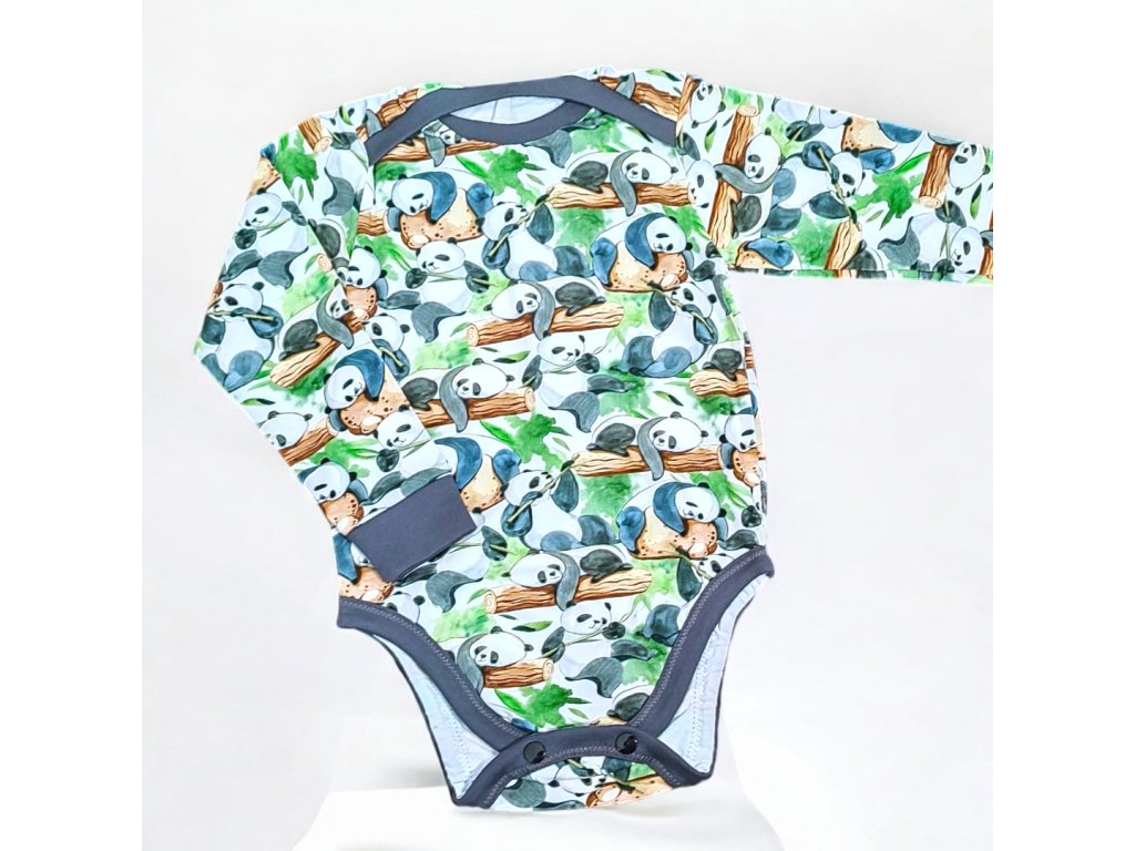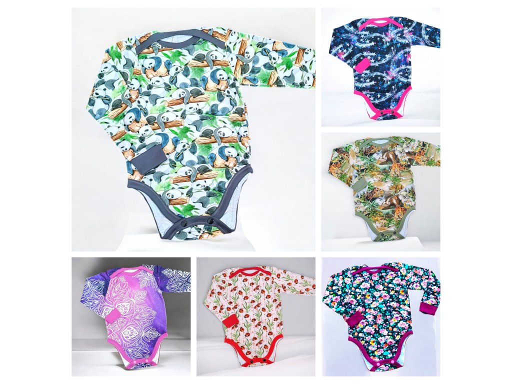 Body je šité z potištěného úpletu. Má dlouhý rukáv, obálkový výstřih pro lepší oblékání a zapínání na patentky.