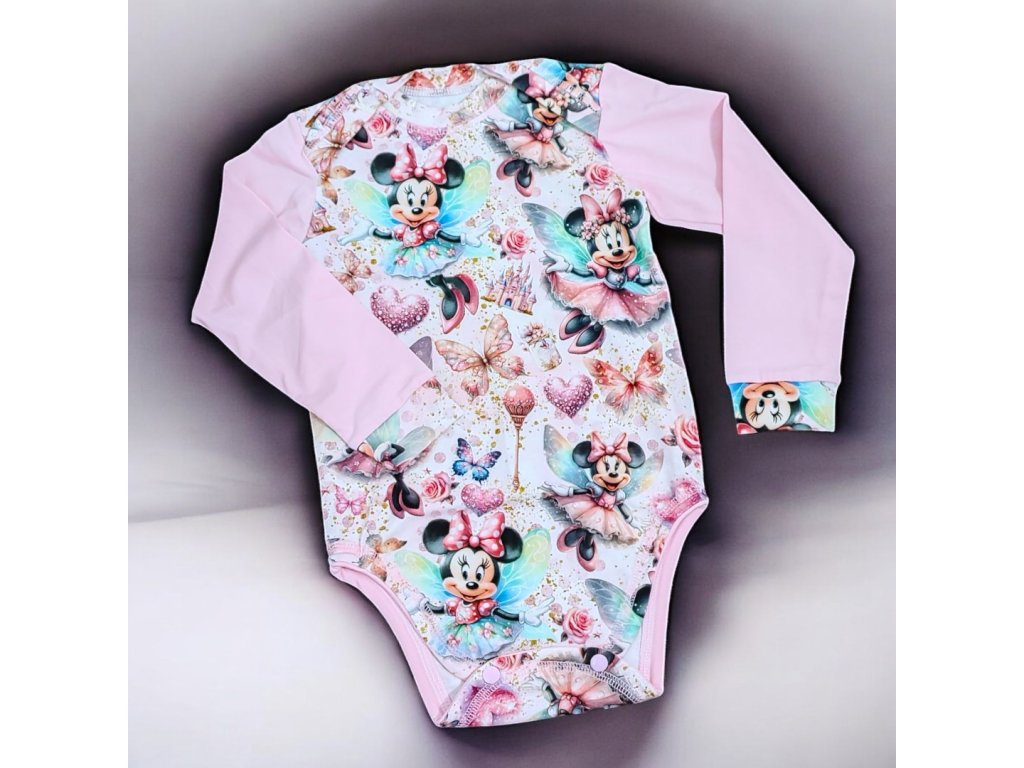 Body je ušité z potištěného úpletu s obrázkovým panelem. Je s dlouhým rukávem, obálkový výstřih pro lepší oblékání, zapínání na patentky.