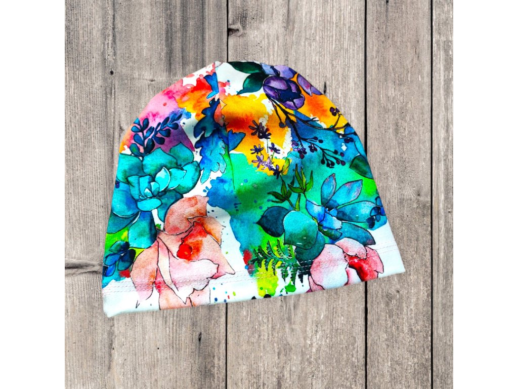 Ušito z potištěného úpletu, klasický střih, jednovrstvá čepice.