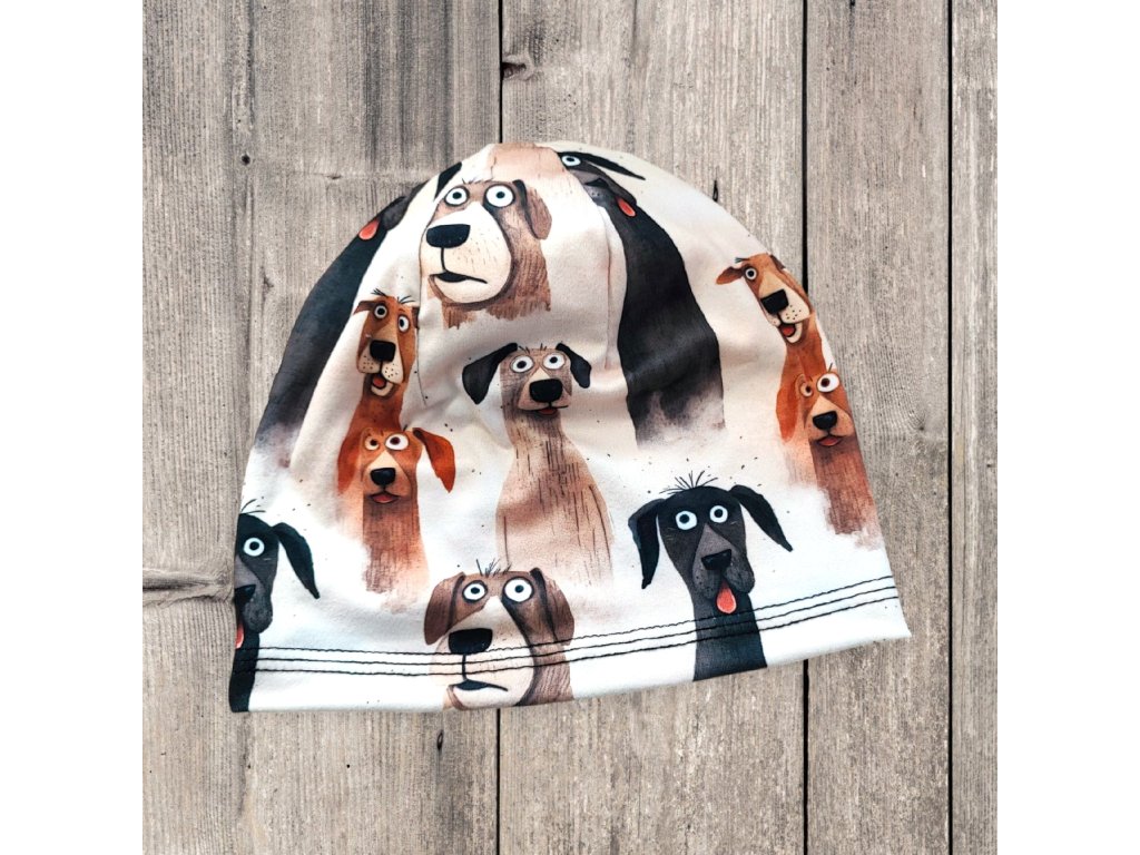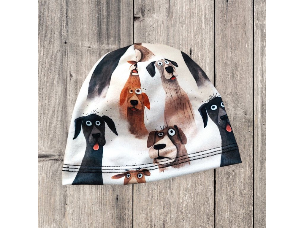 Ušito z potištěného úpletu, klasický střih, jednovrstvá čepice.