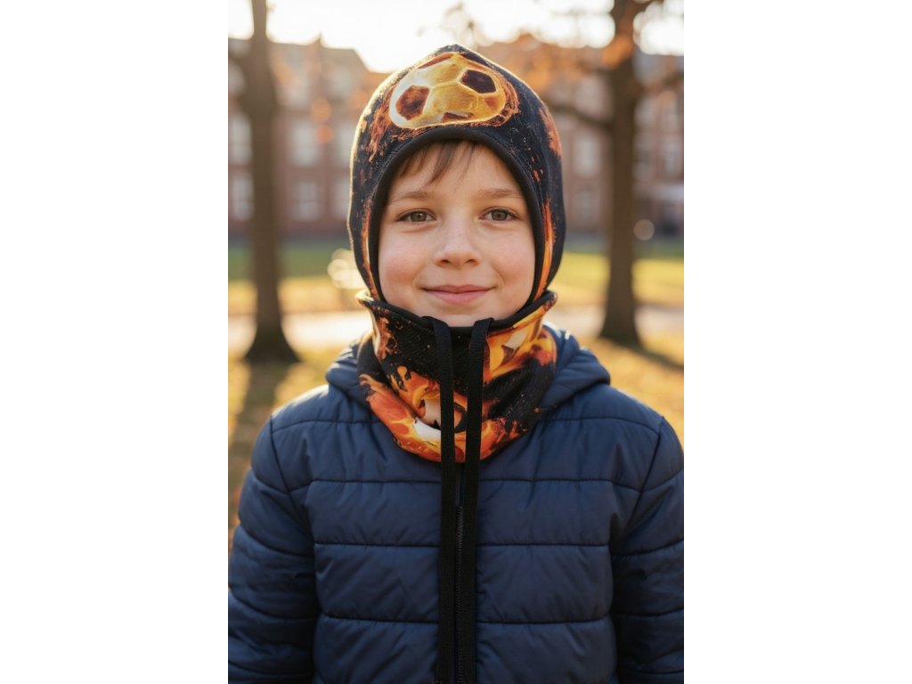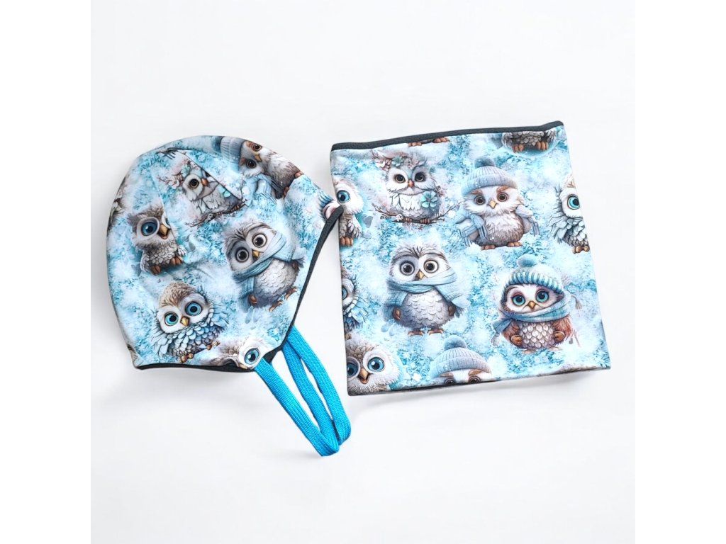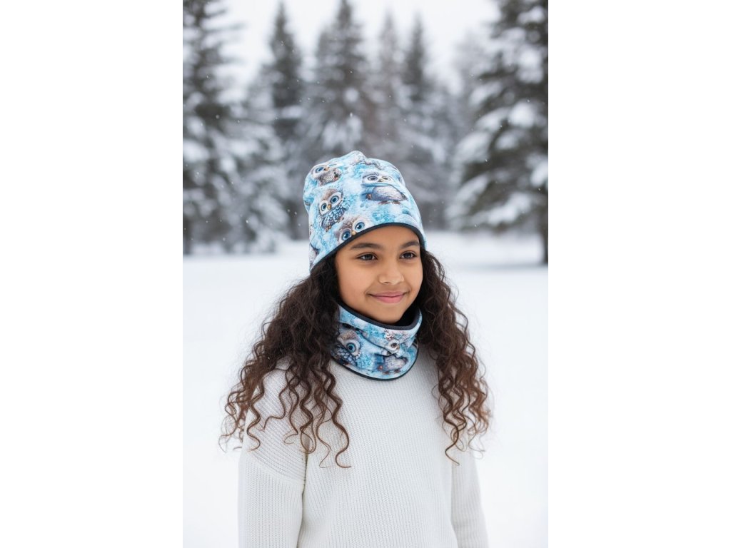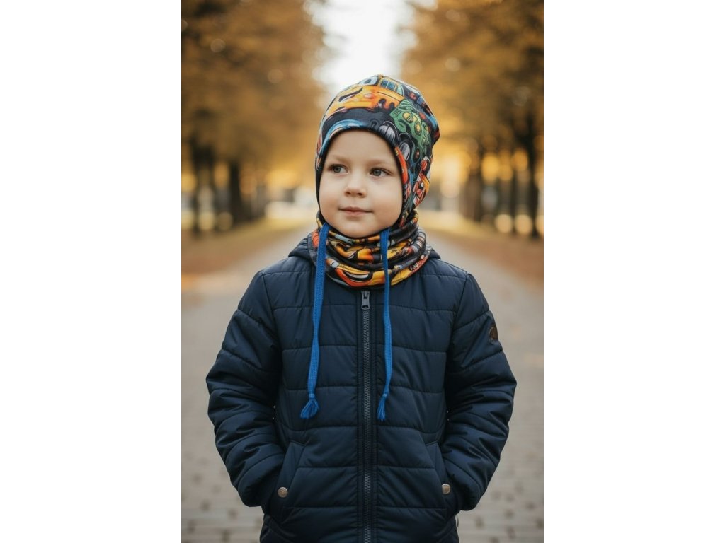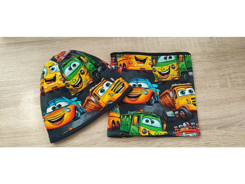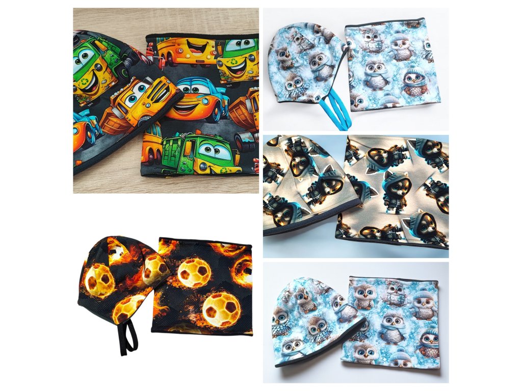 Set je ušitý z potištěného úpletu s flísovou podšívkou. Čepice je klasická rovná nebo ušanka na zavazování. Nákrčník je tunel.