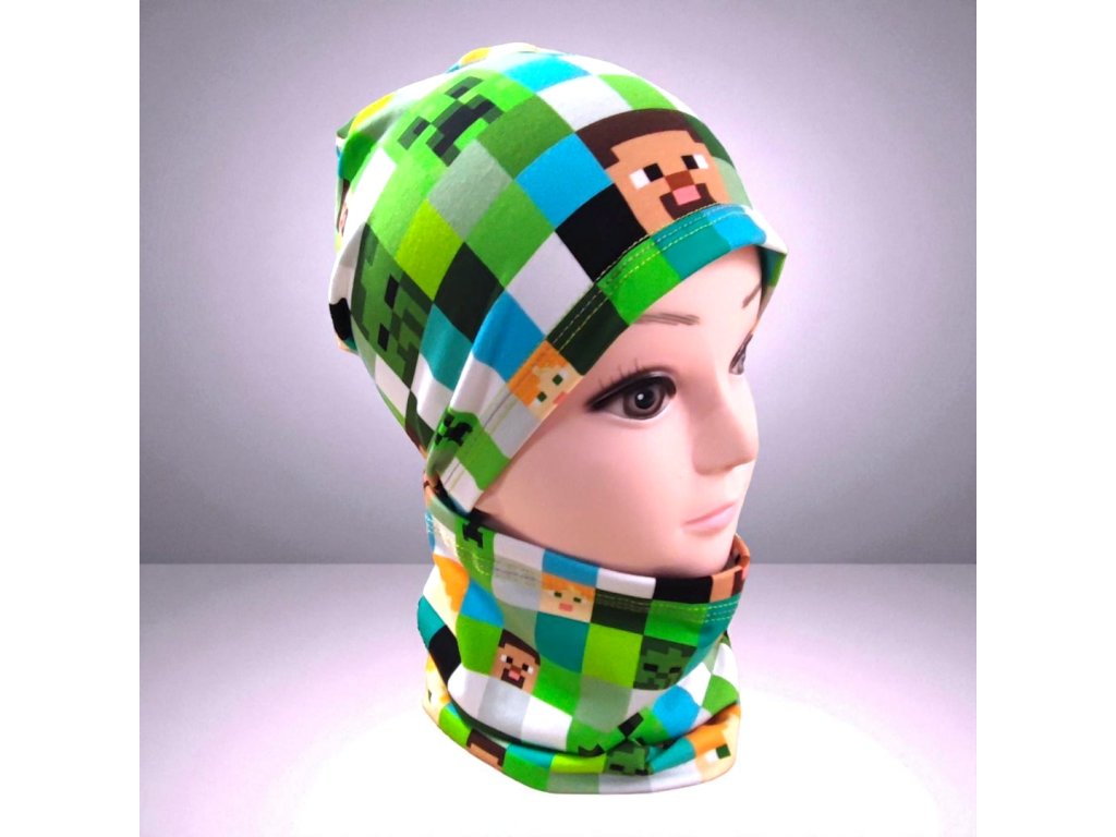 Čepice s nákrčníkem jsou ušité z potištěného úpletu. Klasický rovný střih čepice mírně přepadlý, jednovrstvá verze. Nákrčník dvouvrstvý tunel.