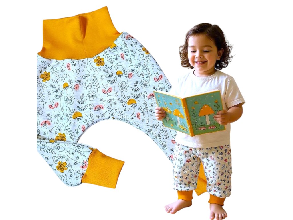 Chlupaté tepláky 56/68 podzimní téma hořčice Holčičí tepláky