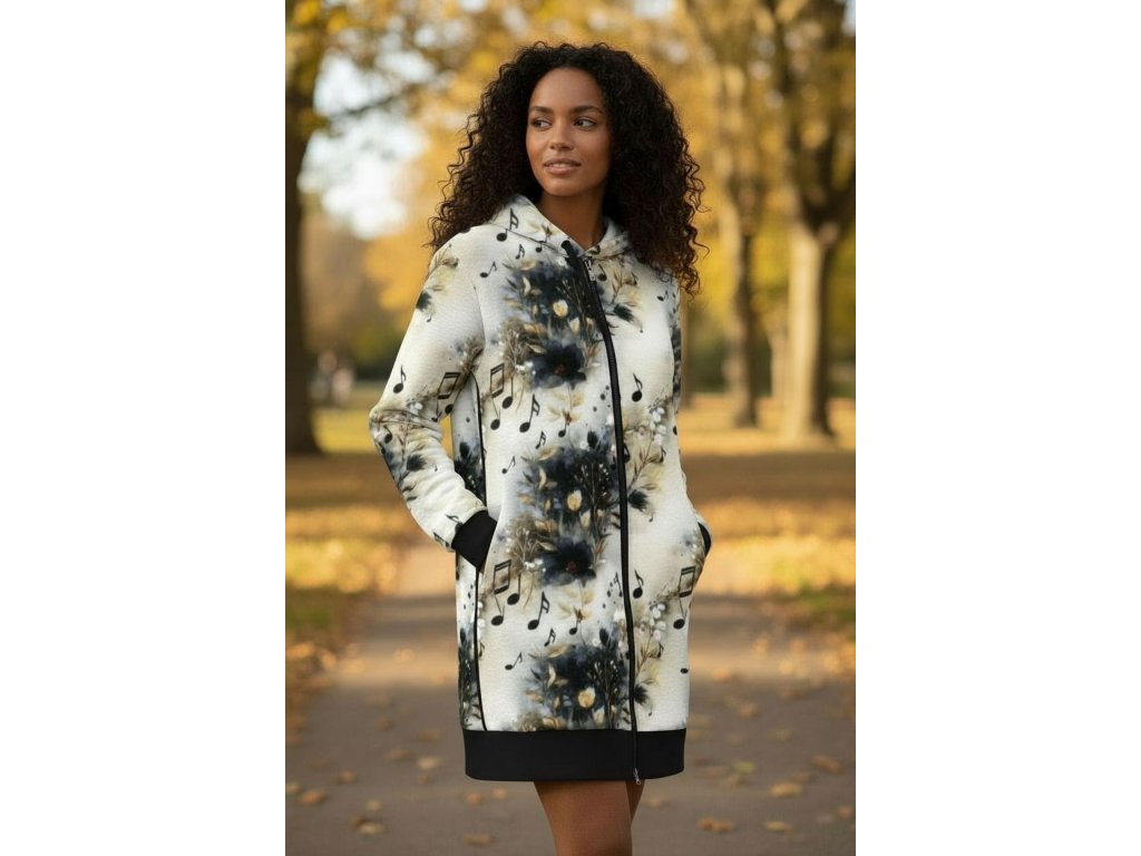 Mikina je ušitá z potištěné i jednobarevné teplakoviny z rubu jemná smyčka. S kapucí, dvě boční kapsy. Rukávy i spodní část zakončeny pružným nápletem.