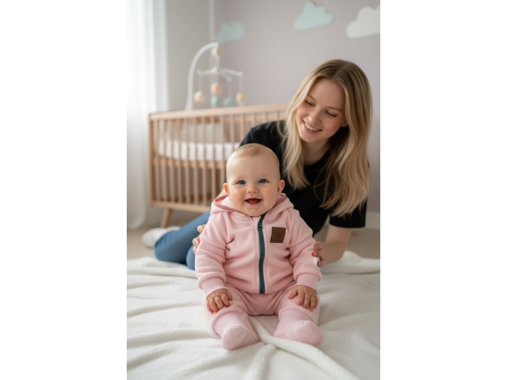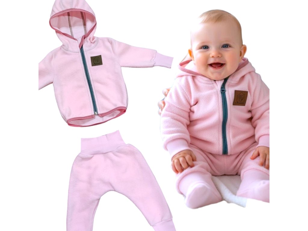 Souprava je šitá z měkkého flísu, který má protižmolkovou úpravu. Mikina je s kapucí, na zip s krytem, bez kapes, zadní díl mírně prodloužený, rukávy zakončené pružným nápletem. Tepláky baggy s kulatým rozkrokem, v pase do vyššího pružného nápletu, nohavice též zakončené pružným nápletem (rostoucí).