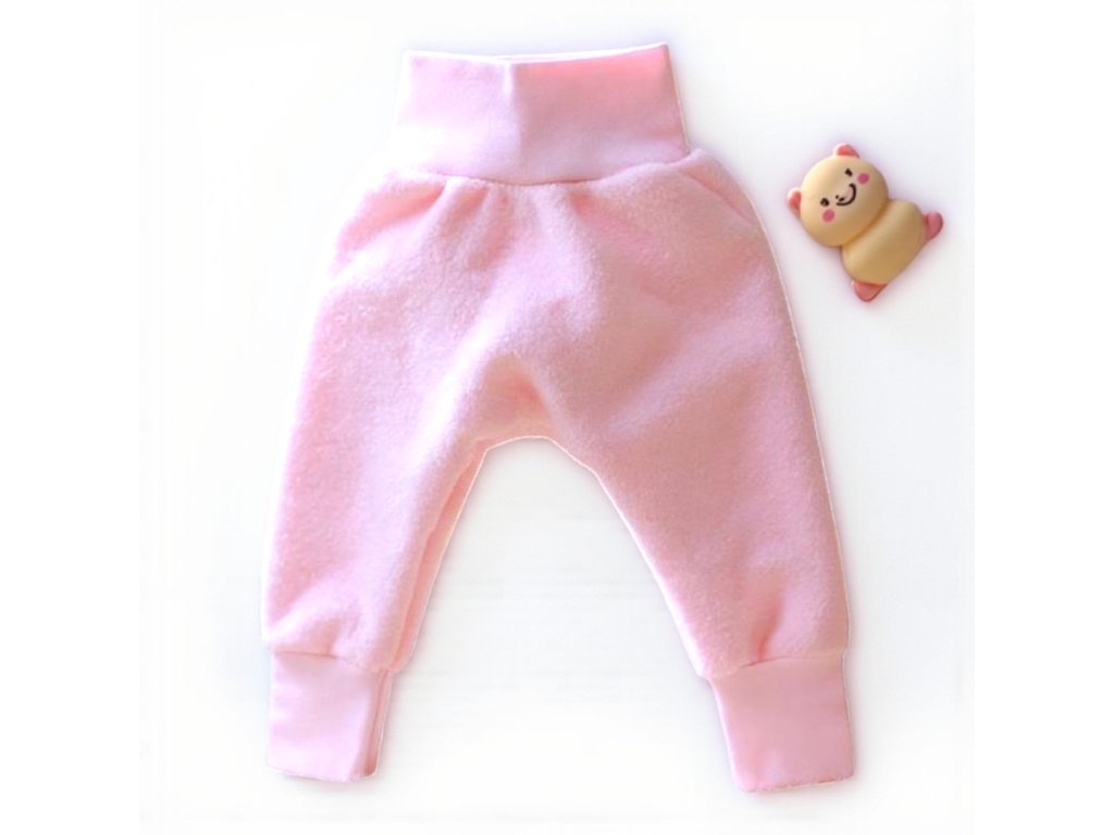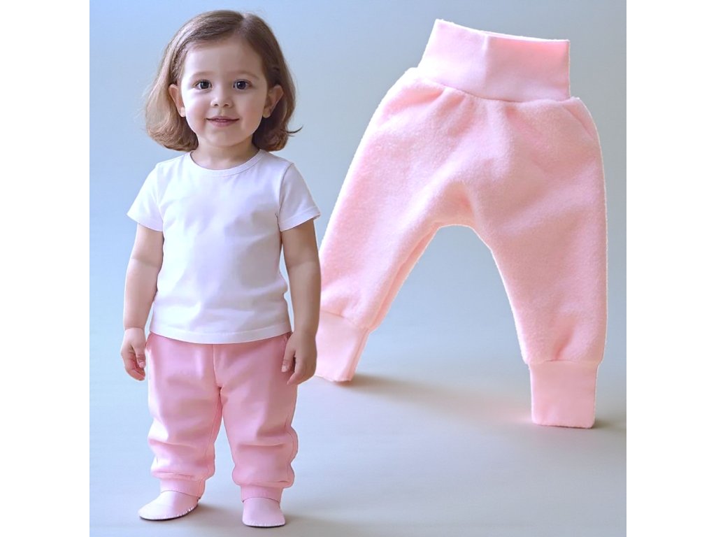 Tepláky jsou šité z jemného flísu, který má protižmolkovou úpravu. Bez kapes, v pase do vyššího pružného nápletu s otvorem pro případné navlečení gumy, nohavice též zakončené pružným nápletem(rostoucí).