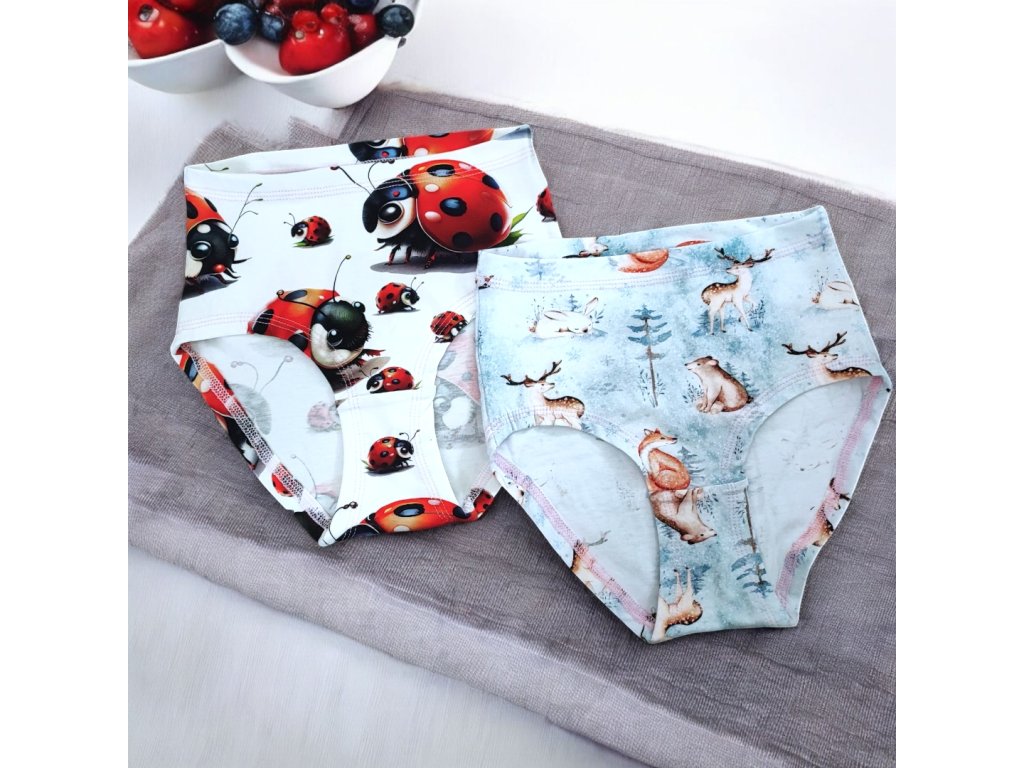 Kalhotky jsou šité z potištěného úpletu, vyšší pas, pružné a velmi pohodlné.