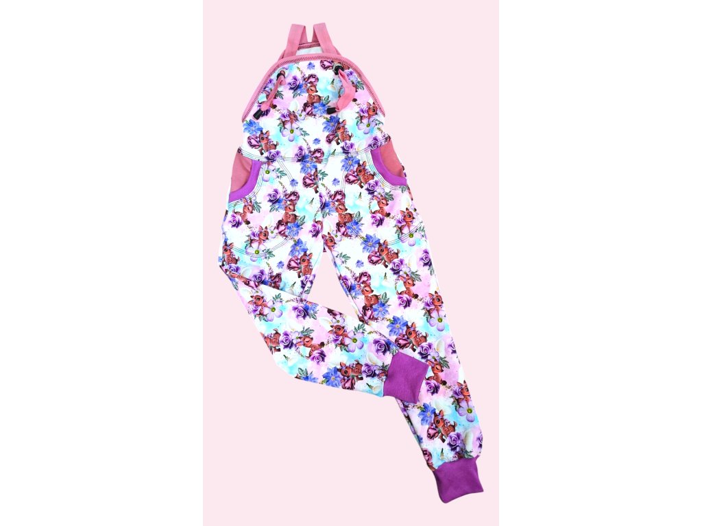 Ušito z potištěné teplakoviny z rubu jemná smyčka, dvě boční kapsy, nohavice zakončené pružným nápletem, zadní lacl řasený gumičkou, na kšandy a lem použita lemovací pruženka. Kšandy lze dle potřeby nastavit olivkou. Při oblékání a svlékání není třeba nic rozepínat, krásně se stáhnou dolů. Rostoucí!