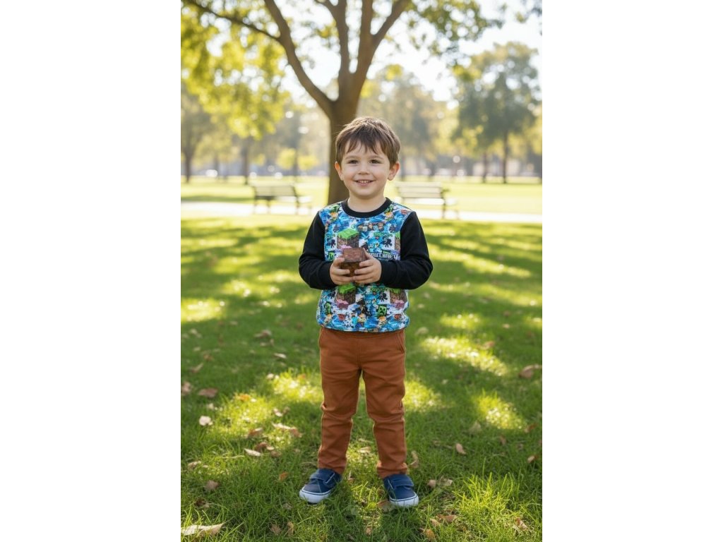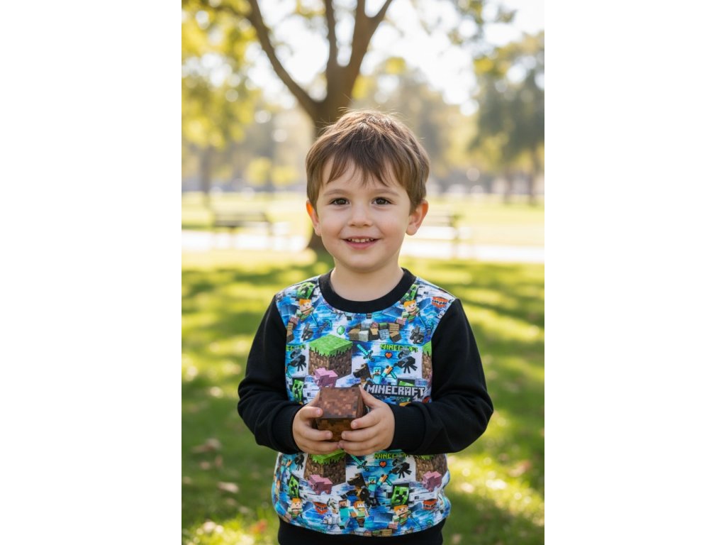 Mikina je ušitá z potištěné i jednobarevné teplakoviny z rubu jemná smyčka, čili slabá teplakovina. Přes hlavu bez kapuce, dvě boční kapsy, rukávy i spodní část zakončeny pružným nápletem (rostoucí).