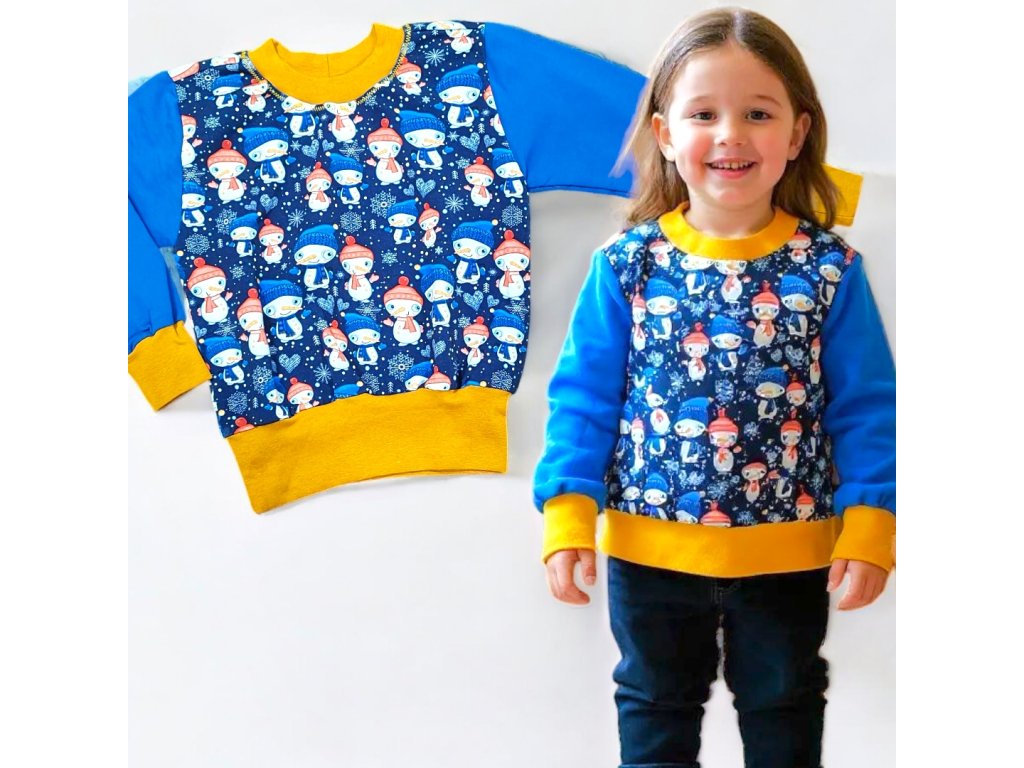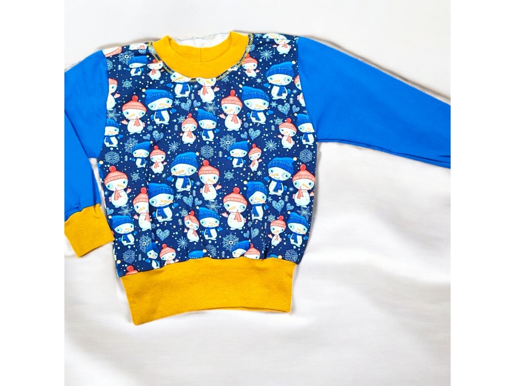 Mikina je ušitá z potištěné i jednobarevné teplakoviny, která je z rubu jemně počesaná čili teplejší. Mikina je přes hlavu s kulatým výstřihem, bez kapuce, bez kapes. Rukávy i spodní část zakončeny pružným nápletem (rostoucí). Zadní díl je se vzorem.