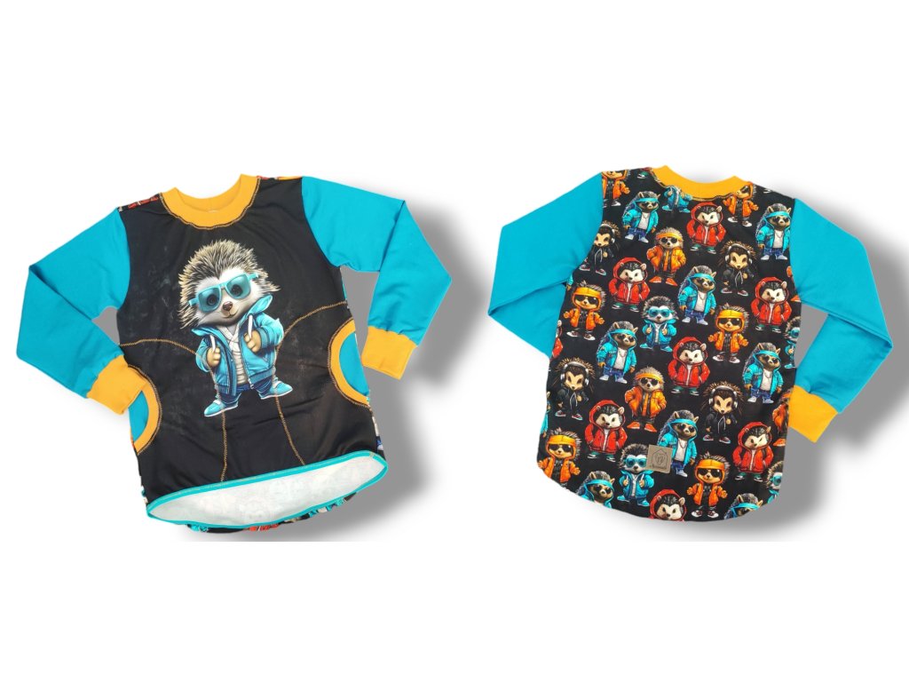 Mikina je ušitá z potištěné i jednobarevné teplakoviny z rubu jemná smyčka čili slabá teplakovina. Mikina je přes hlavu bez kapuce, klokaní kapsa, rukávy jsou zakončeny pružným nápletem, zadní díl mírně prodloužený a spodní část je zakončena pružnou lemovkou.