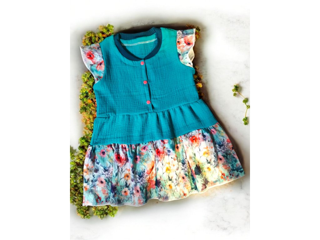 Šaty jsou s krátkým volánkovým rukávem, řasená květová sukýnka, zapínání na tři patentky od krku.