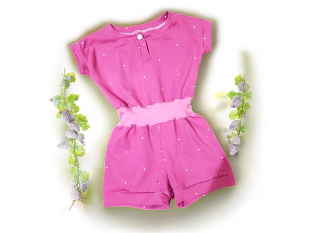 Overal je ušitý z potištěného úpletu, s krátkým volánkovým rukávem, krátké nohavice, zapínání na patentky.
