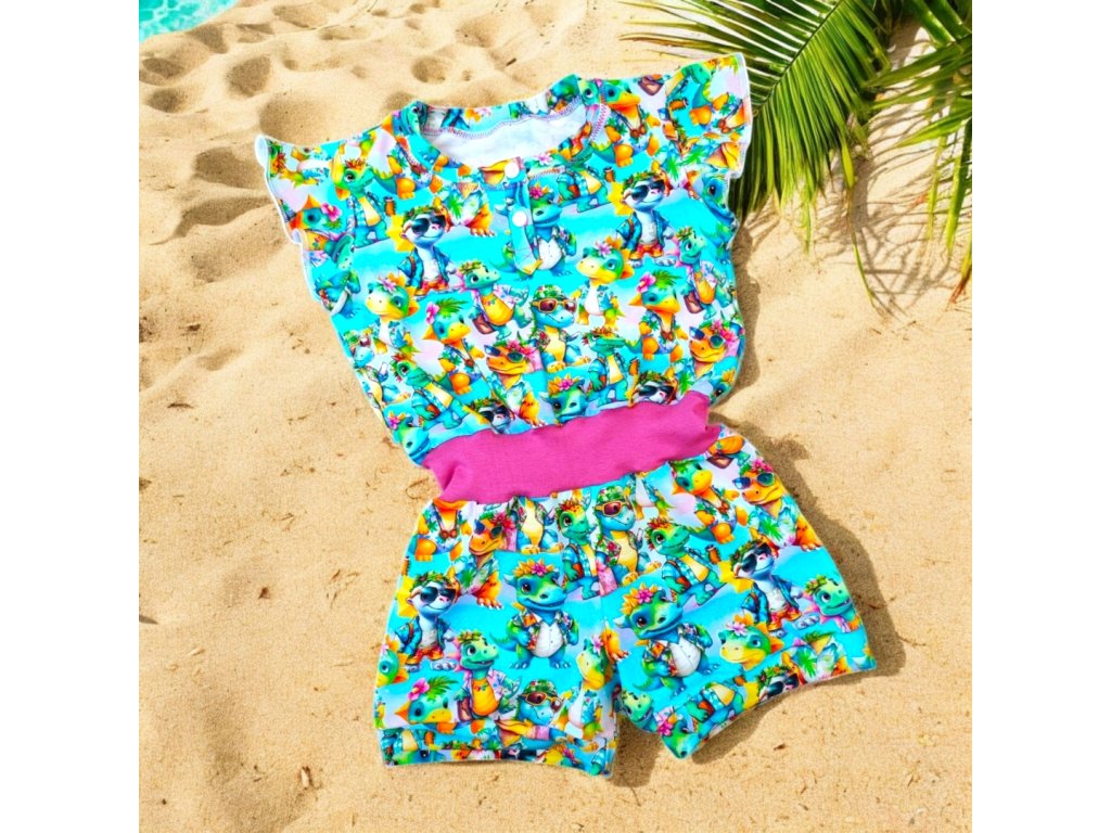 Overal je ušitý z potištěného úpletu, s krátkým volánkovým rukávem, krátké nohavice, zapínání na patentky.