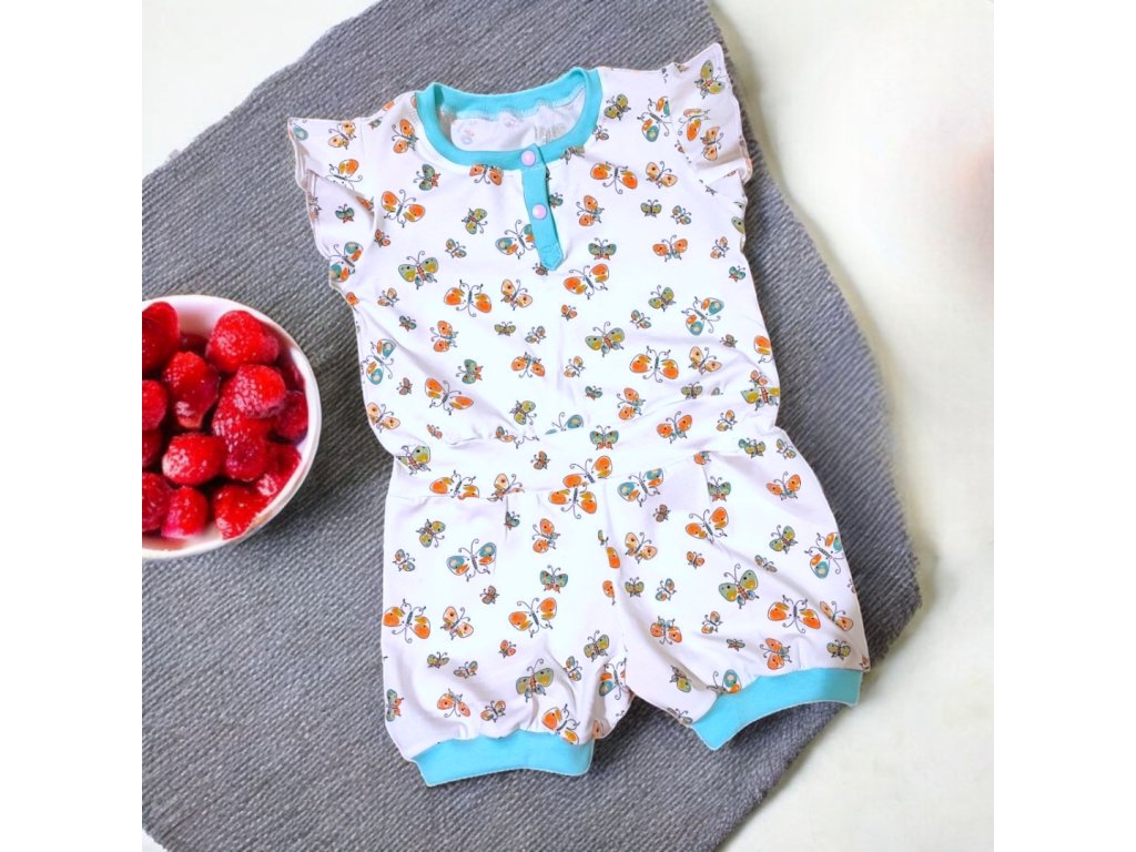 Overal je ušitý z potištěného úpletu, s krátkým volánkovým rukávem, krátké nohavice, zapínání na patentky.