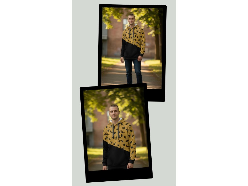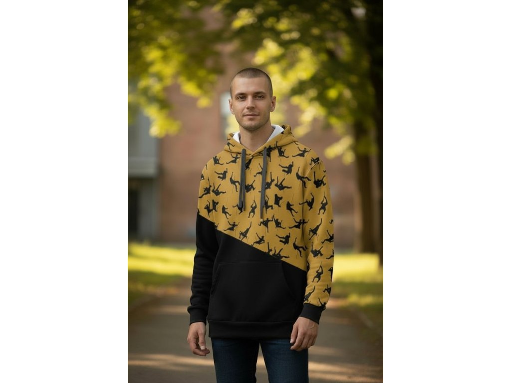 Mikina je ušitá z potištěné i jednobarevné teplakoviny z rubu jemná smyčka. S kapucí, dvě boční kapsy. Rukávy i spodní část zakončeny pružným nápletem.