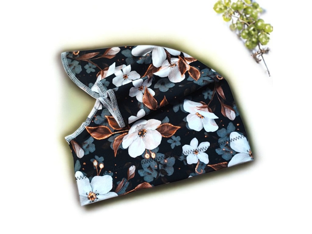 Šátek je ušitý z potištěného úpletu, bez kšiltu.