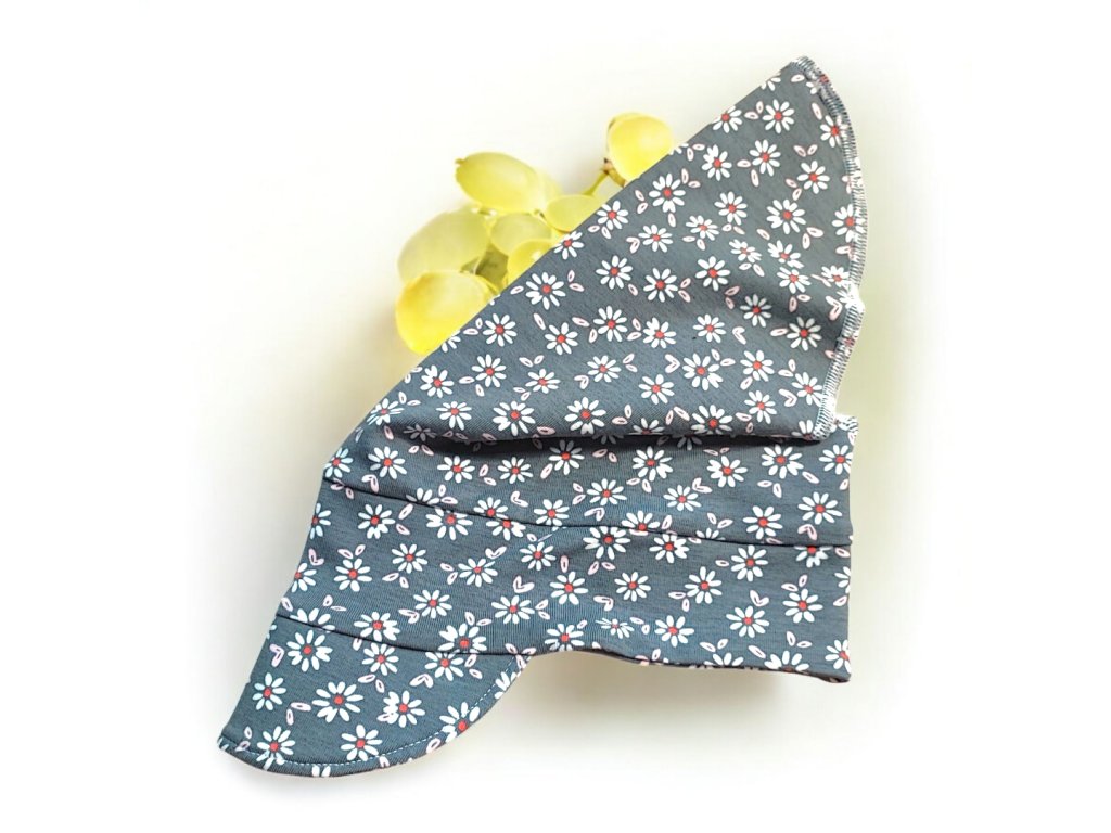 Šátek je ušitý z potištěného úpletu, s kšiltem.