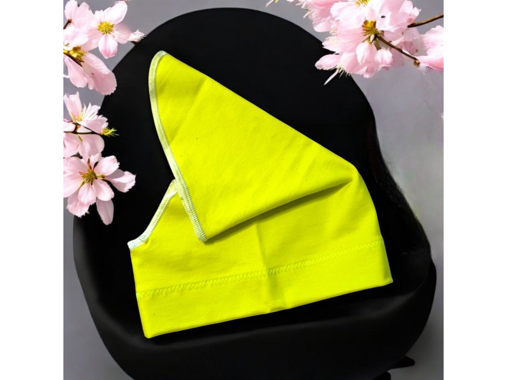 Šátek je ušitý z potištěného úpletu, bez kšiltu.