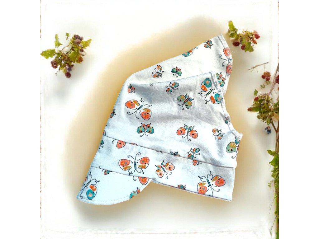 Šátek je ušitý z potištěného úpletu, s kšiltem.