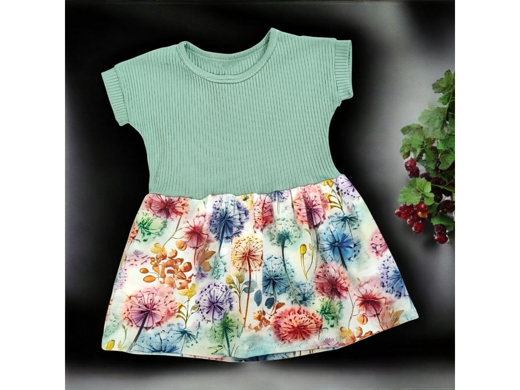 Šatičky jsou šité z potištěného úpletu i jednobarevného žebrovaného úpletu v mátové barvě, s krátkým přinechaným rukávem, kulatý výstřih, řasená sukýnka.