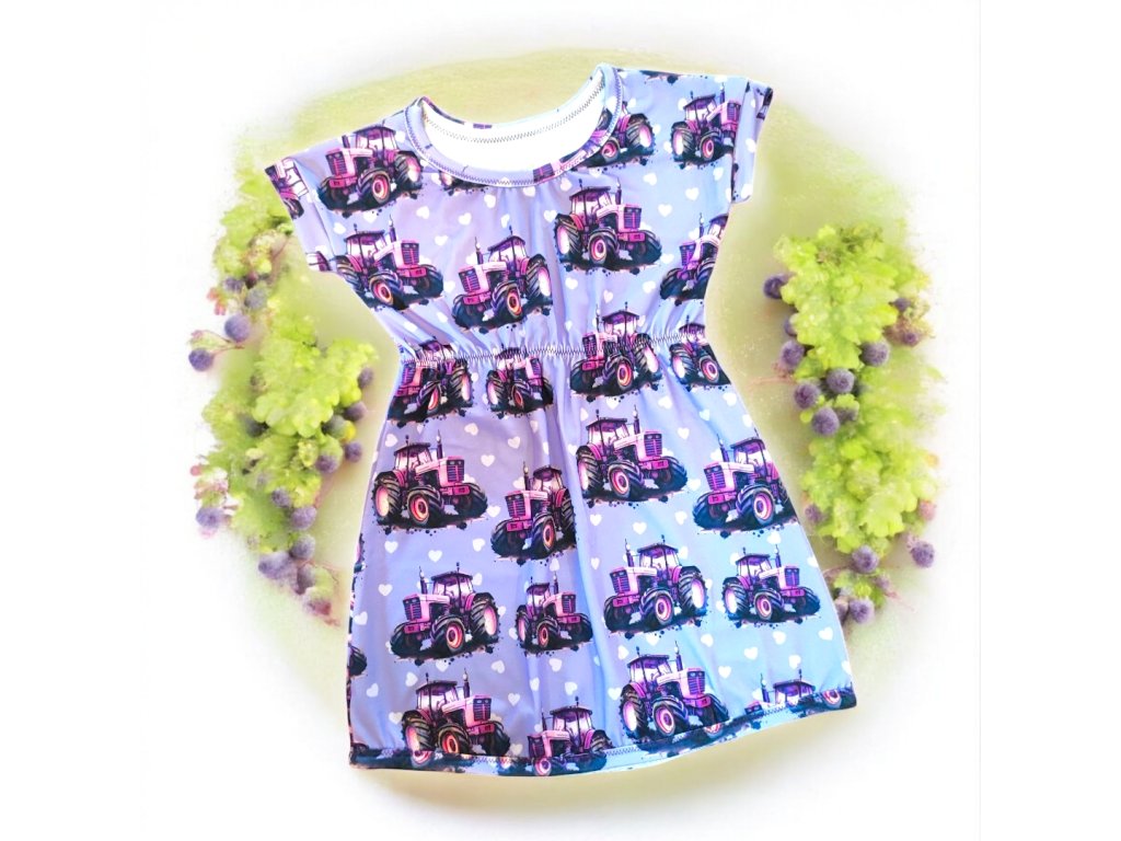 Šatičky fialové traktory lila 110/116 Dívčí šaty