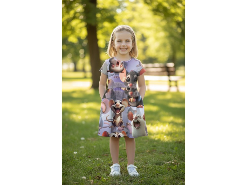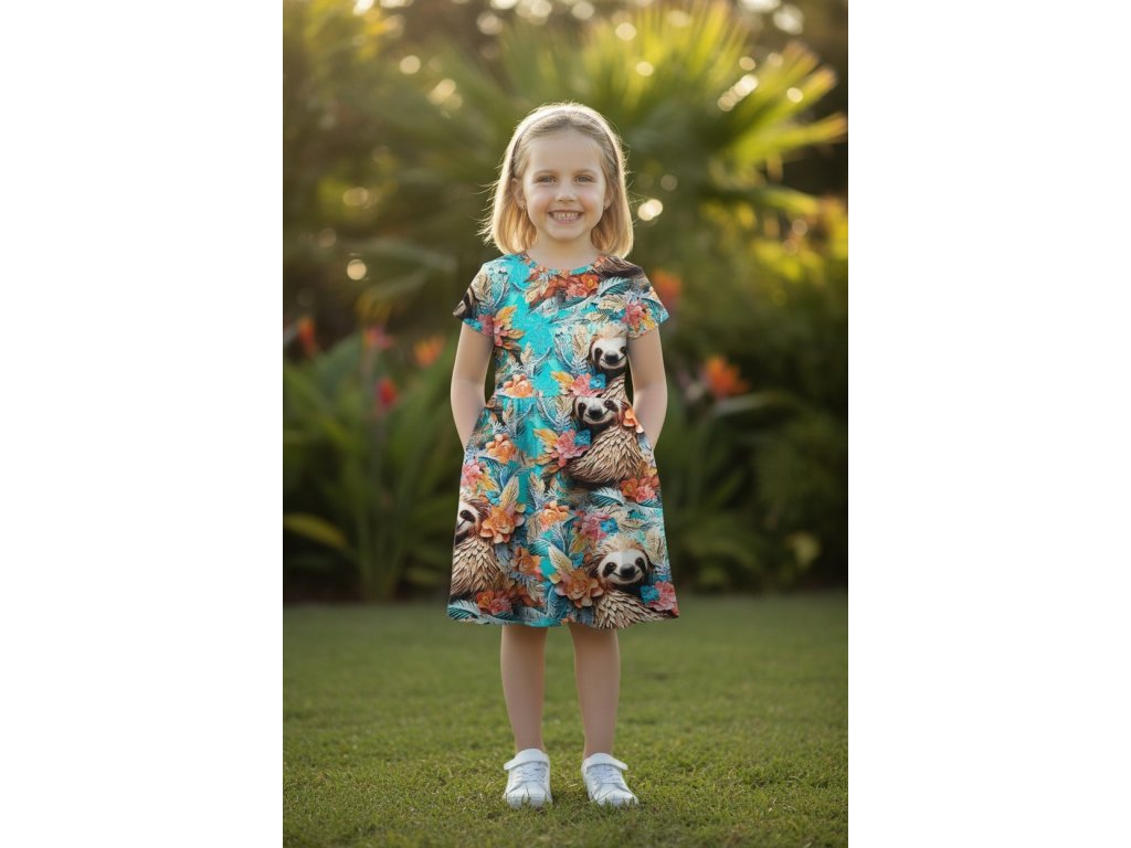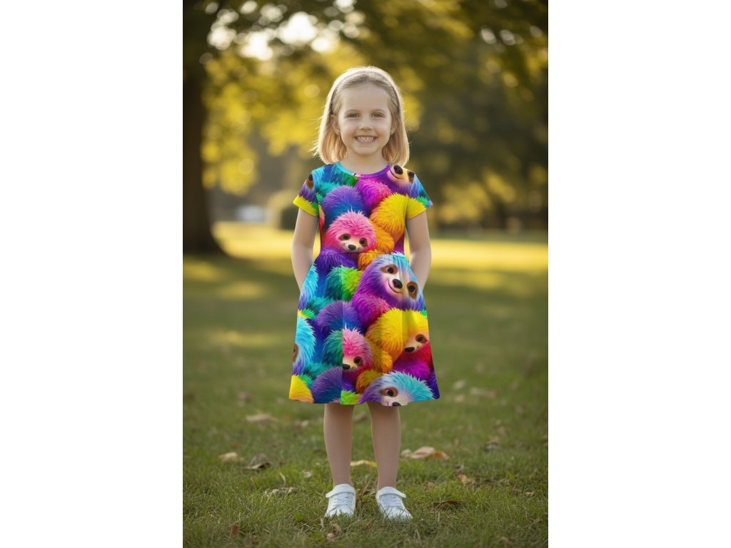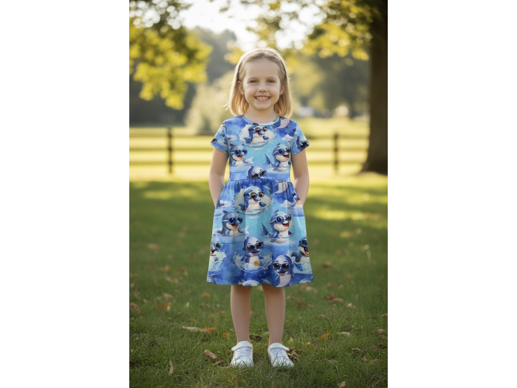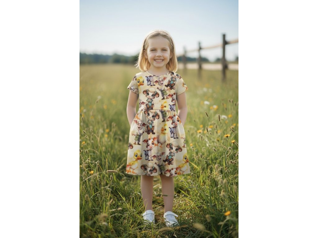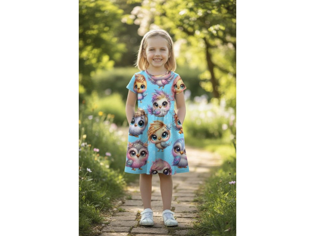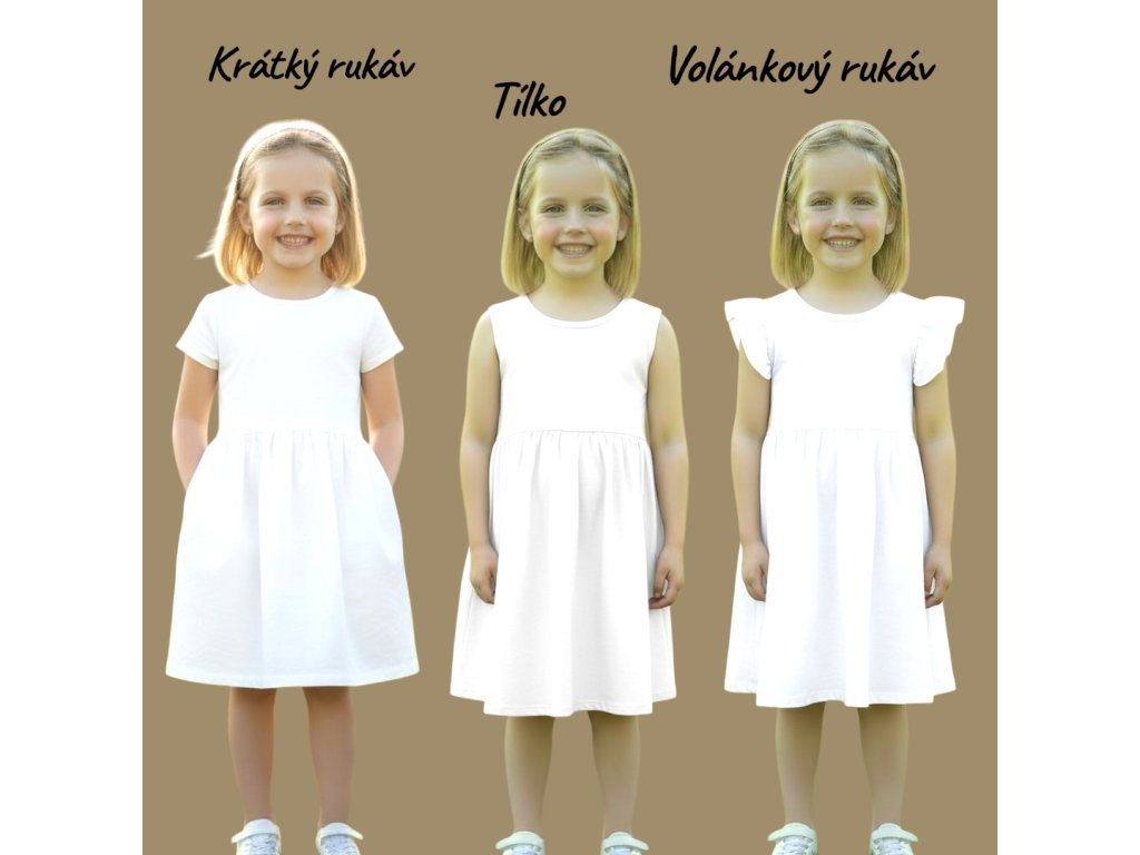 Šatičky jsou šité z potištěného úpletu, s krátkým rukávem, bez rukávu, s volánkovým rukávem. Kulatý výstřih, řasená sukýnka. Různé motivy a velikosti.
