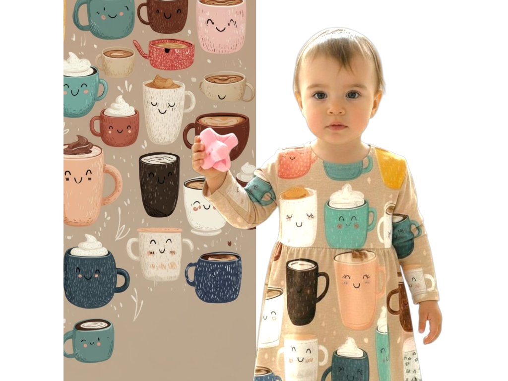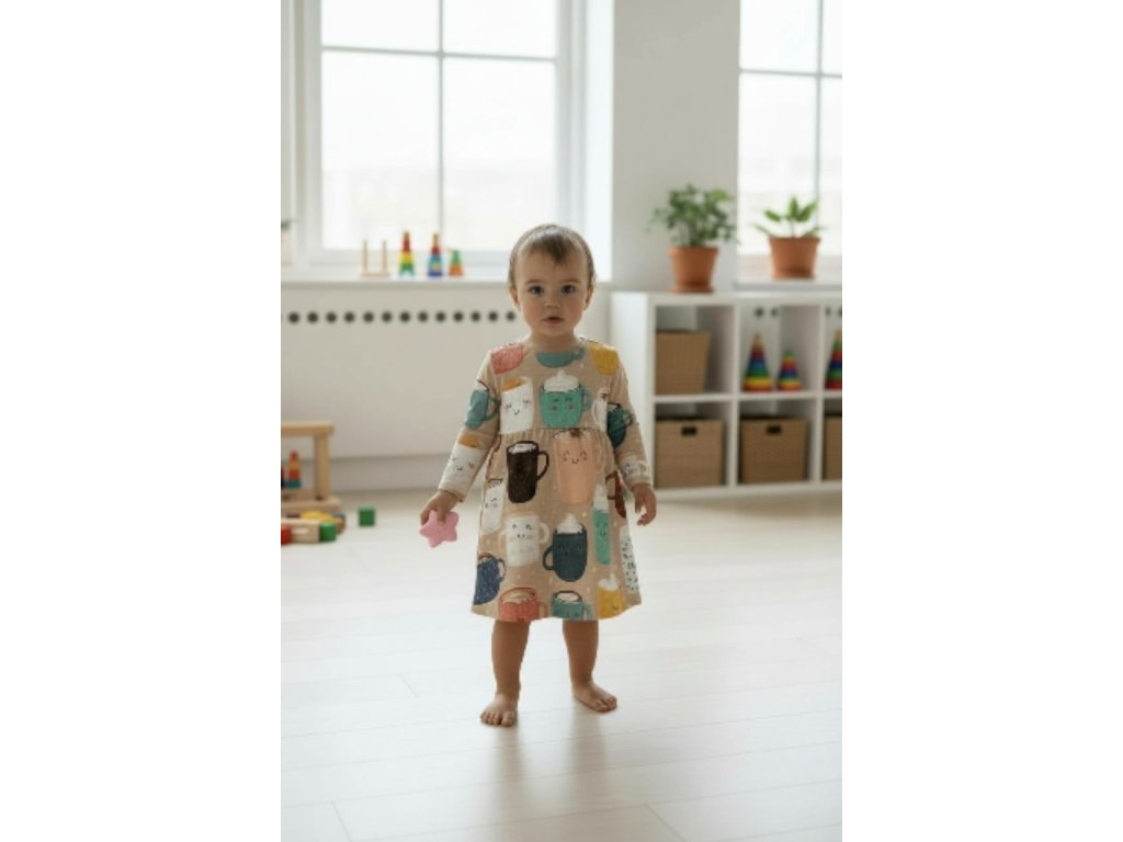 Šatičky jsou šité z potištěného úpletu, s dlouhým rukávem, kulatý výstřih, řasená sukýnka. Krásný tematický zimní vzor pro milovníky horké čokolády.
