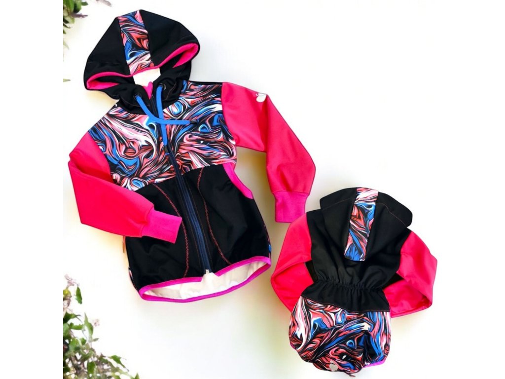 Bunda je ušitá z potištěného i jednobarevného softshellu, který má z rubu flís. Bunda je na zip s kapucí, která lze podle potřeby stáhnout olivkou, dvě boční kapsy, prodloužený zadní díl, který je mírně řasený v pase gumičkou.