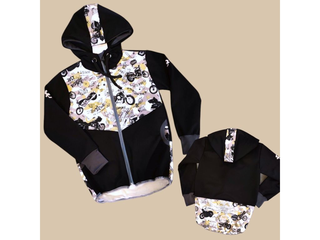 Bunda je ušitá z potištěného i jednobarevného softshellu, který má z rubu flís. Bunda je na zip s kapucí, která lze podle potřeby stáhnout olivkou, dvě boční kapsy, prodloužený zadní díl.