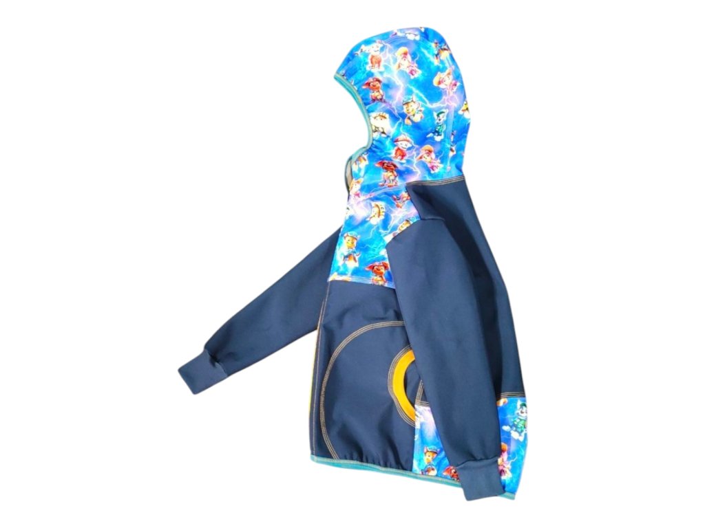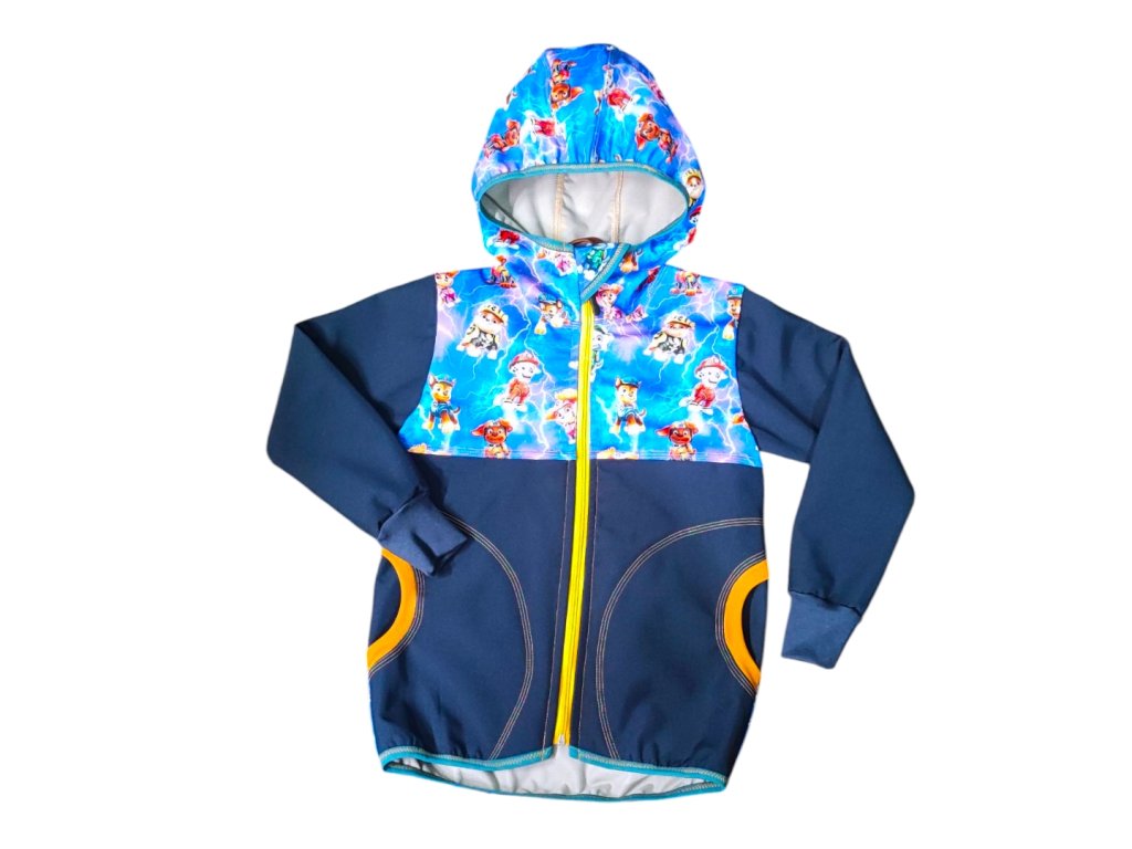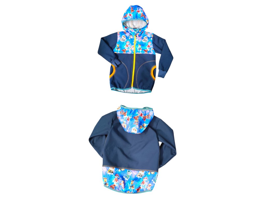 Bunda je ušitá z potištěného i jednobarevného softshellu z rubu jemný flís. Je na zip s krytem, s kapucí, dvě boční kapsy, rukávy jsou zakončeny pružným nápletem, zadní díl je mírně prodloužený.