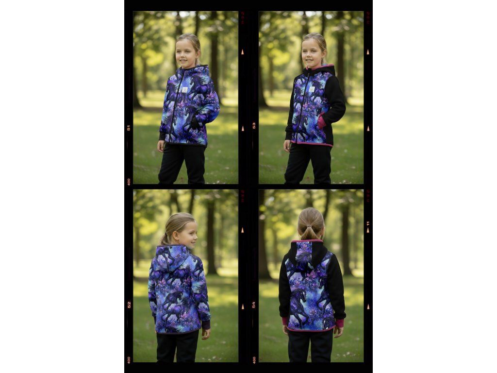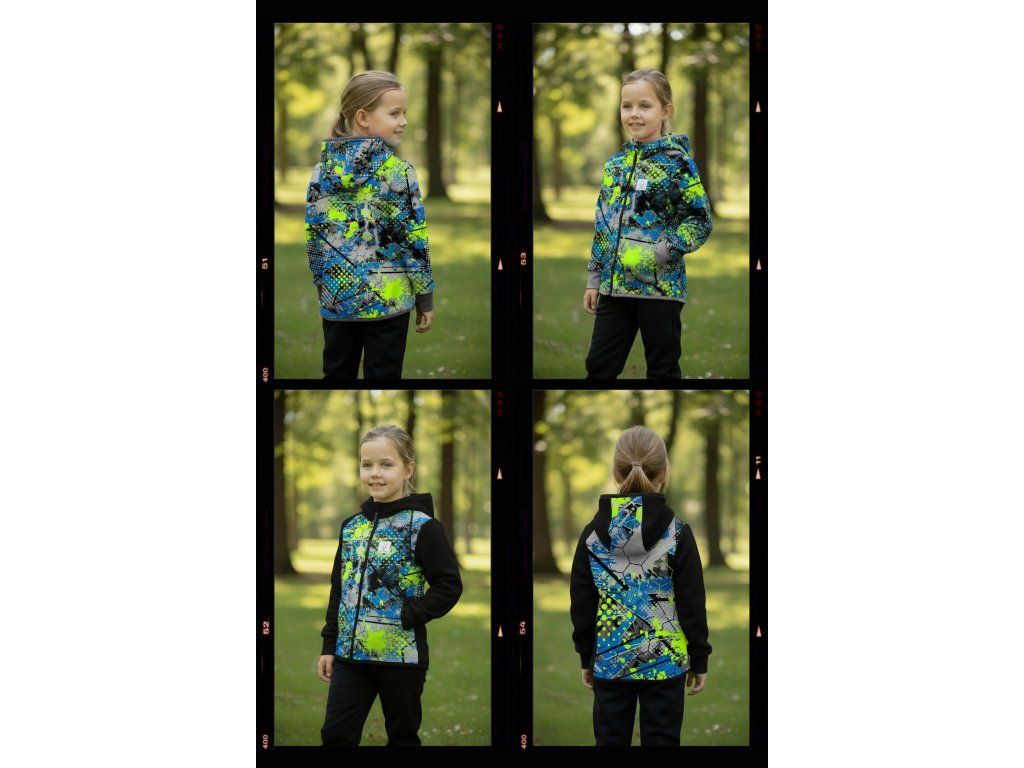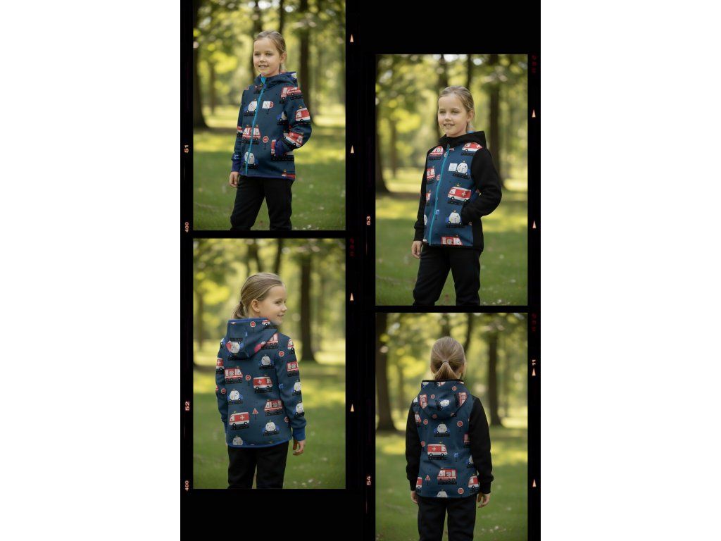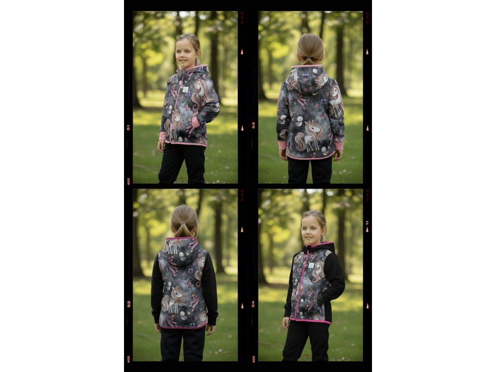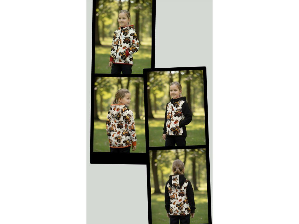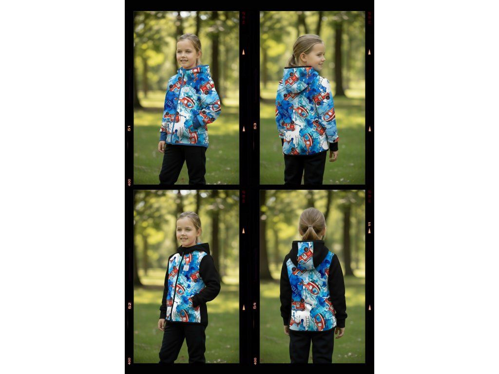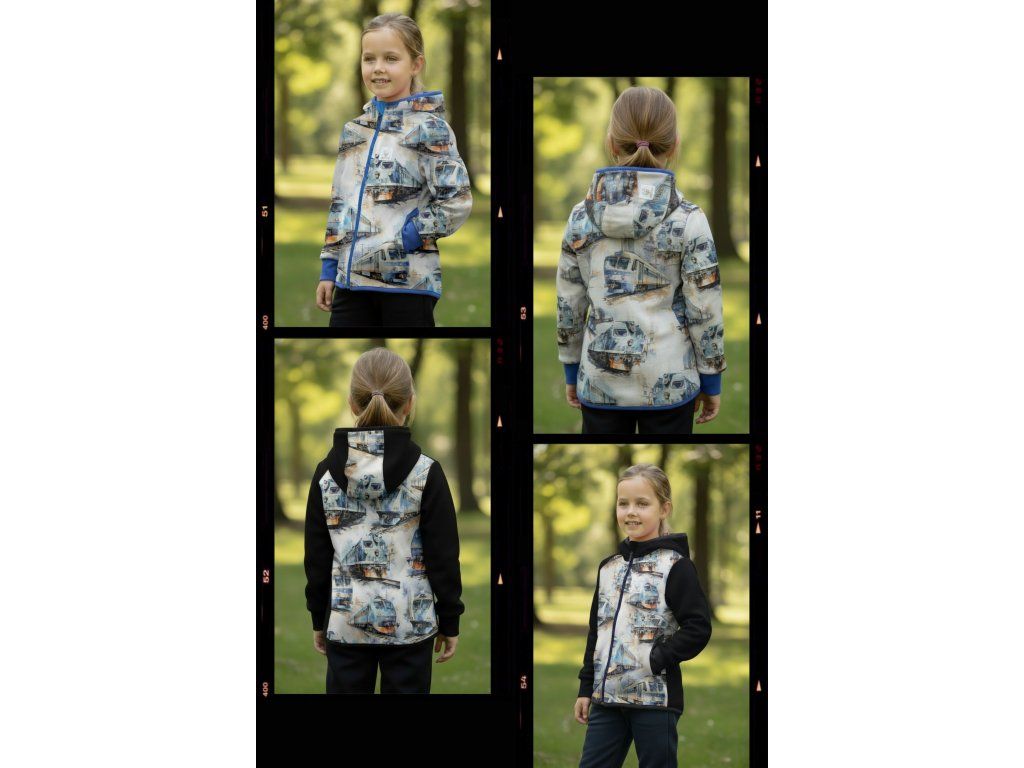 Bunda je ušitá z potištěného i jednobarevného softshellu, který má z rubu jemný flís, možno ušít i z letního softshellu, který z rubu nemá nic. Stačí připsat do poznámky k objednávce! Není problém se domluvit i na jiné barevné kombinaci.