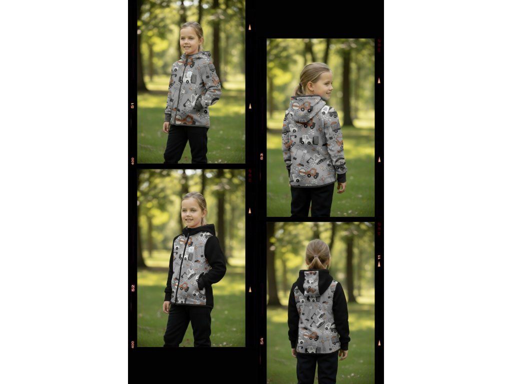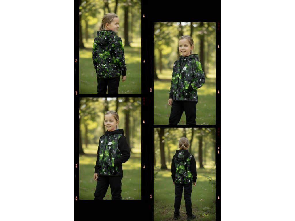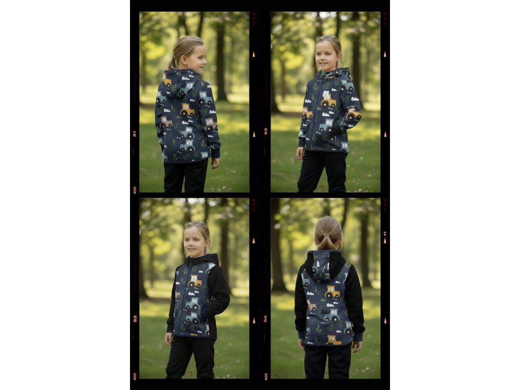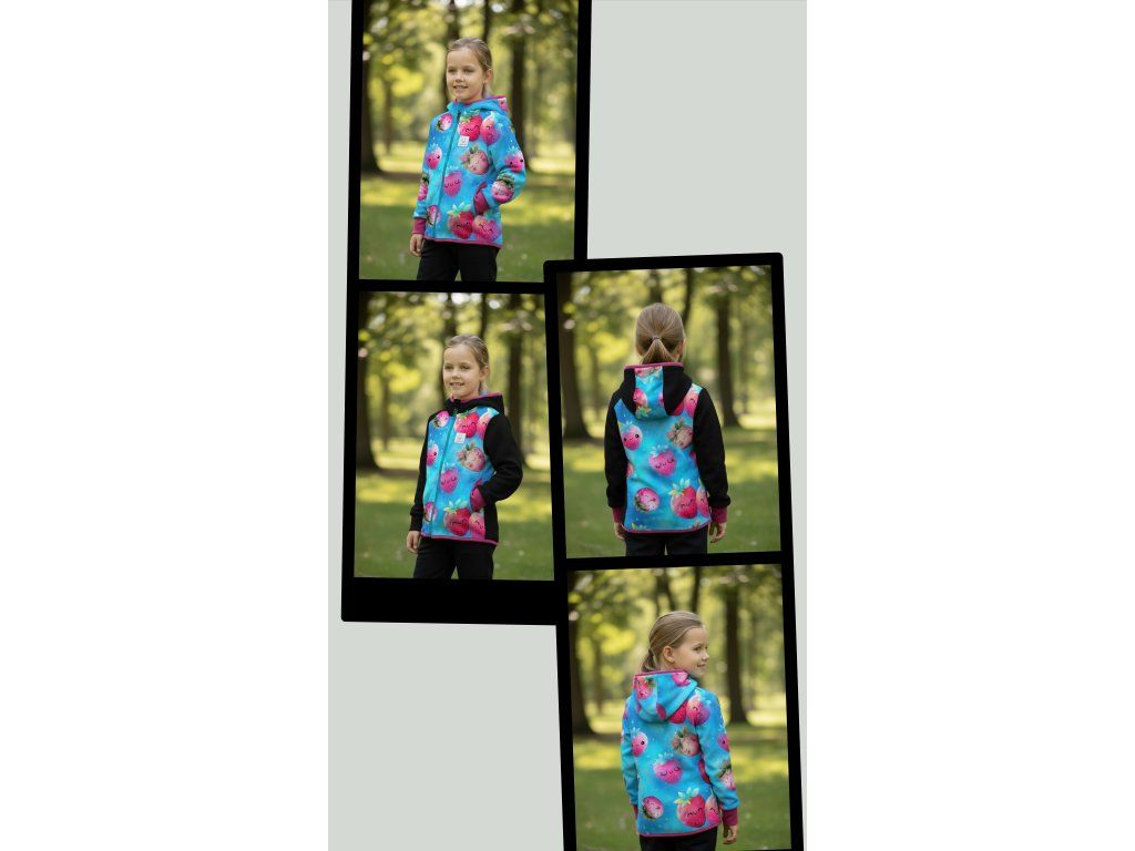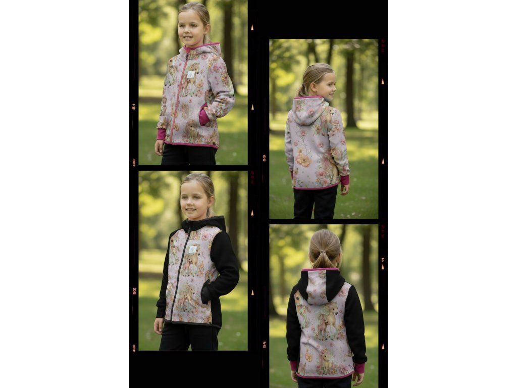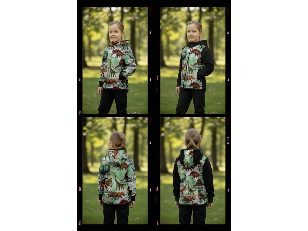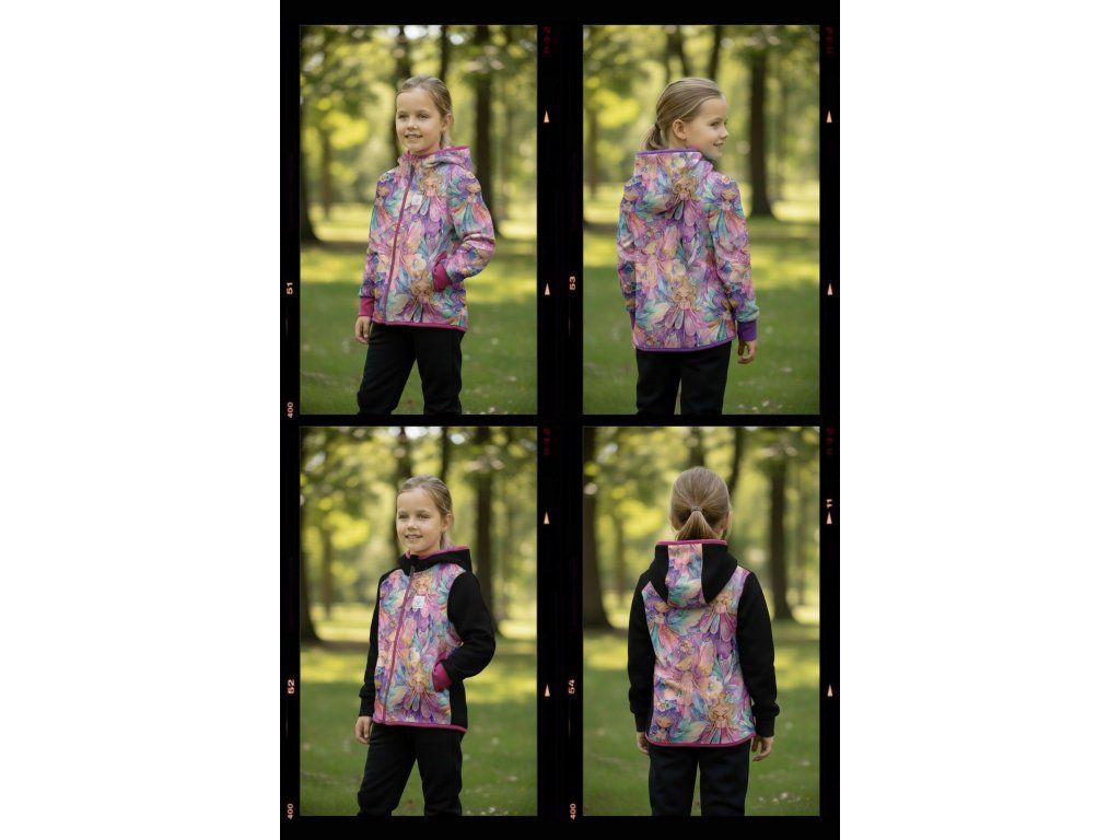 Bunda je ušitá z potištěného i jednobarevného softshellu, který má z rubu jemný flís, možno ušít i z letního softshellu, který z rubu nemá nic. Stačí připsat do poznámky k objednávce! Není problém se domluvit i na jiné barevné kombinaci.