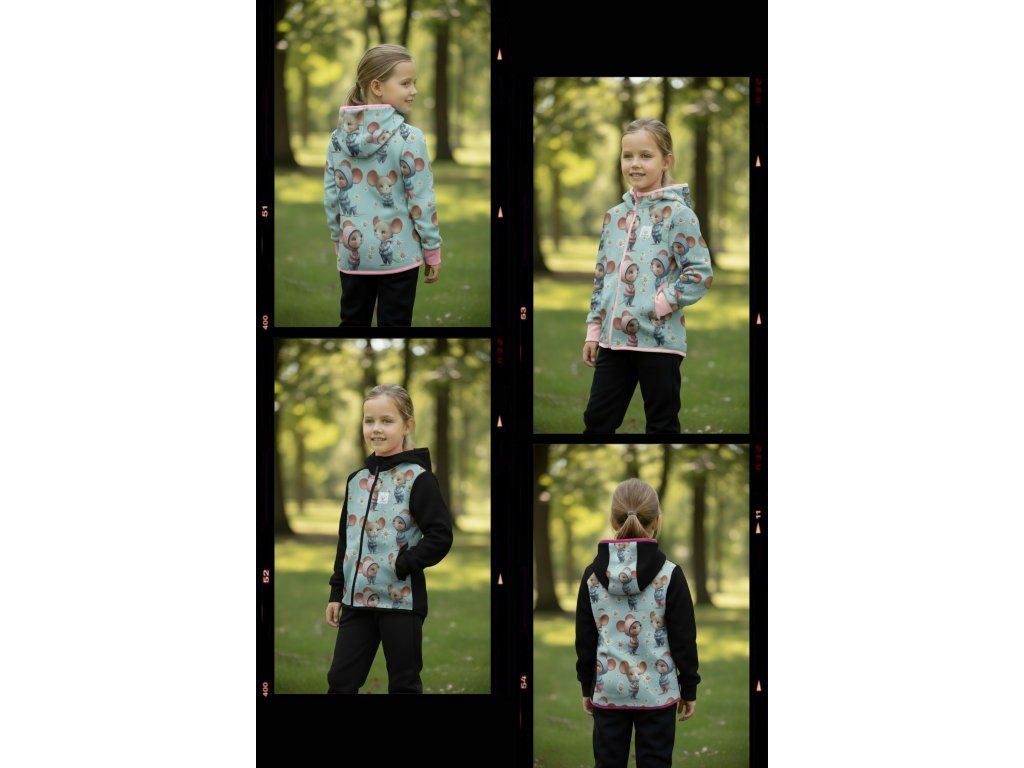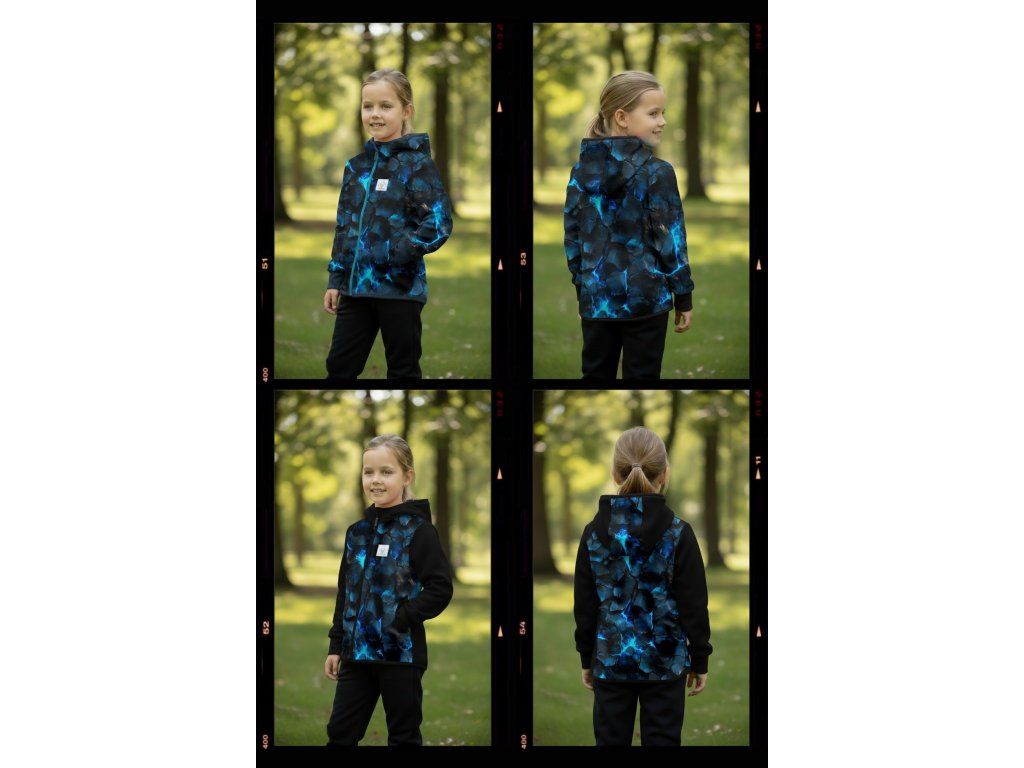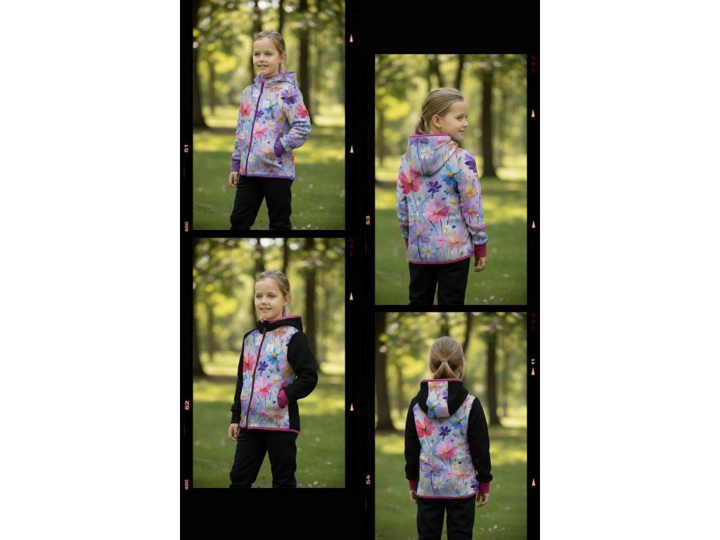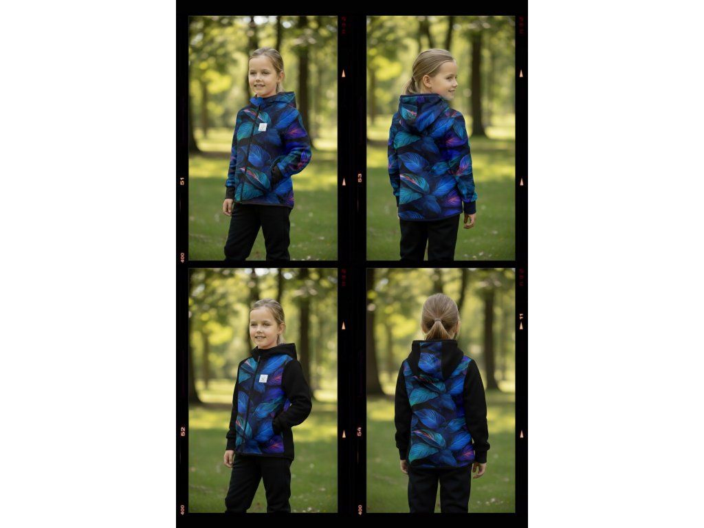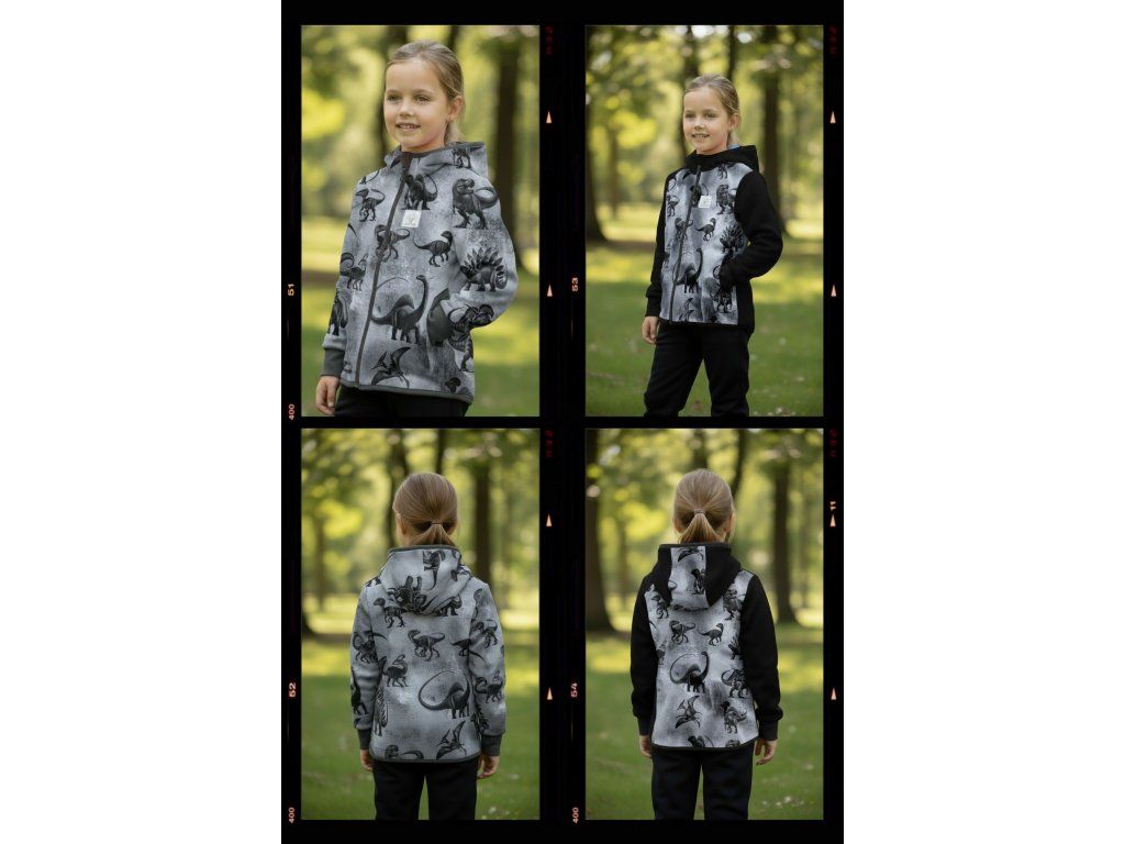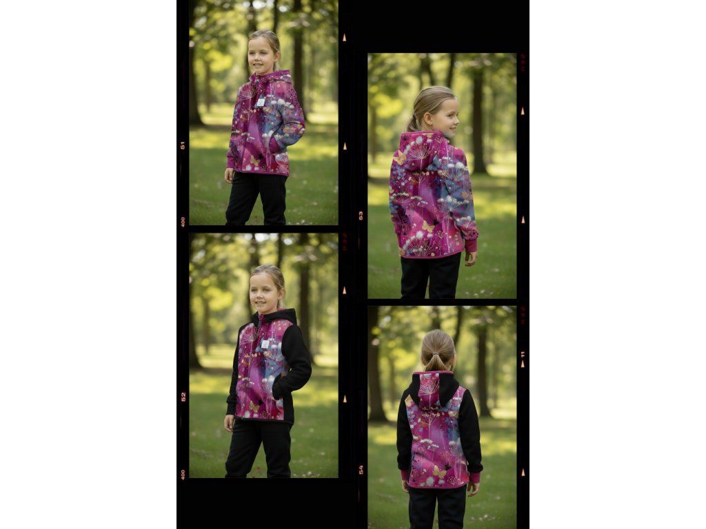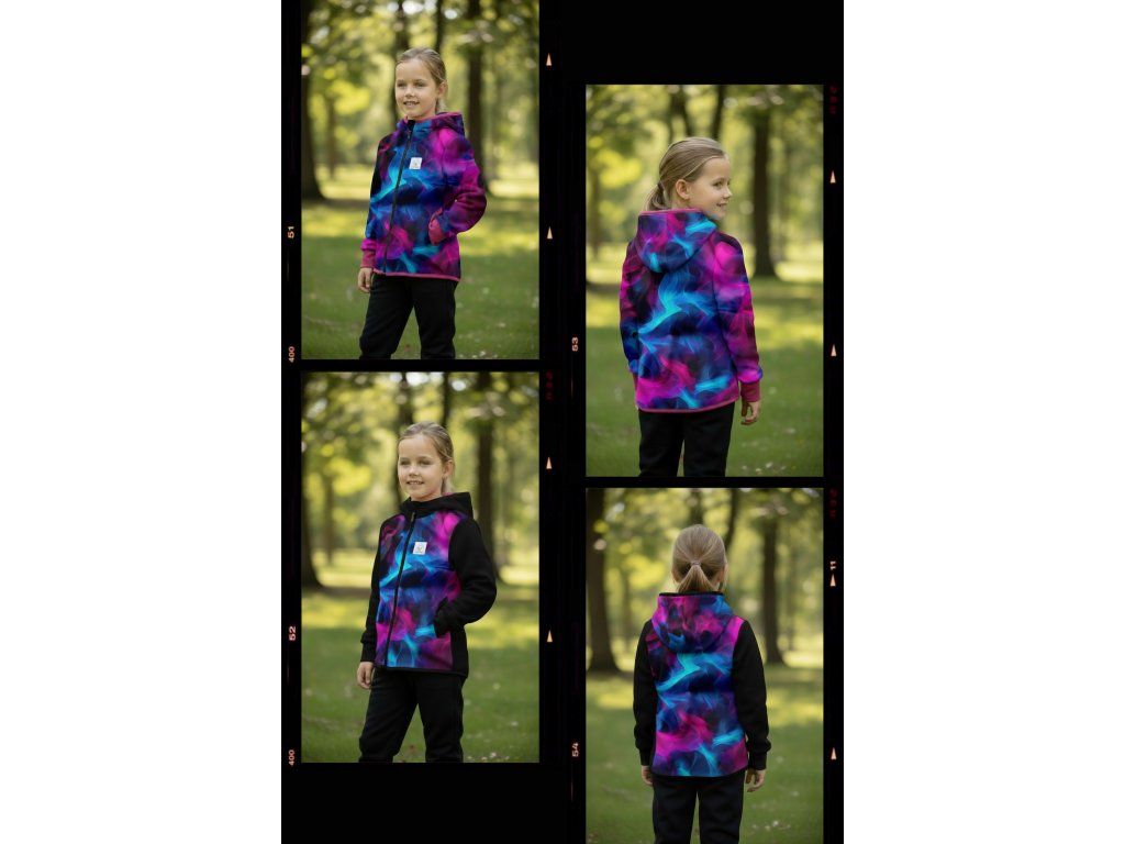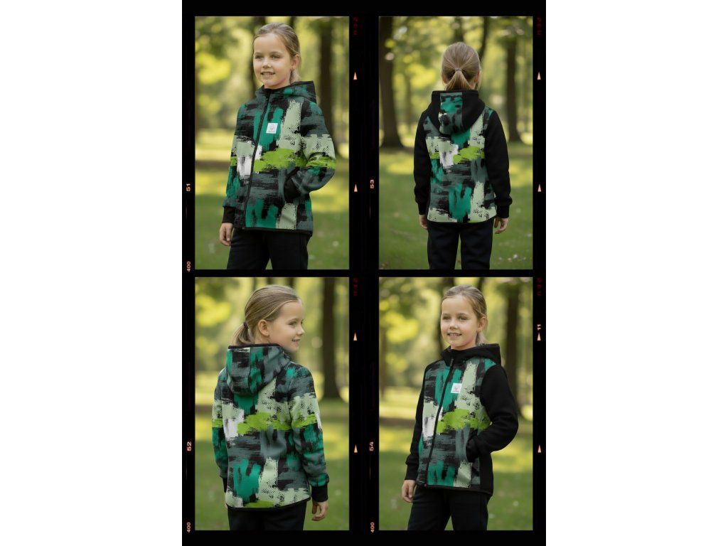Bunda je ušitá z potištěného i jednobarevného softshellu, který má z rubu jemný flís, možno ušít i z letního softshellu, který z rubu nemá nic. Stačí připsat do poznámky k objednávce! Není problém se domluvit i na jiné barevné kombinaci.