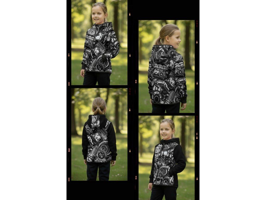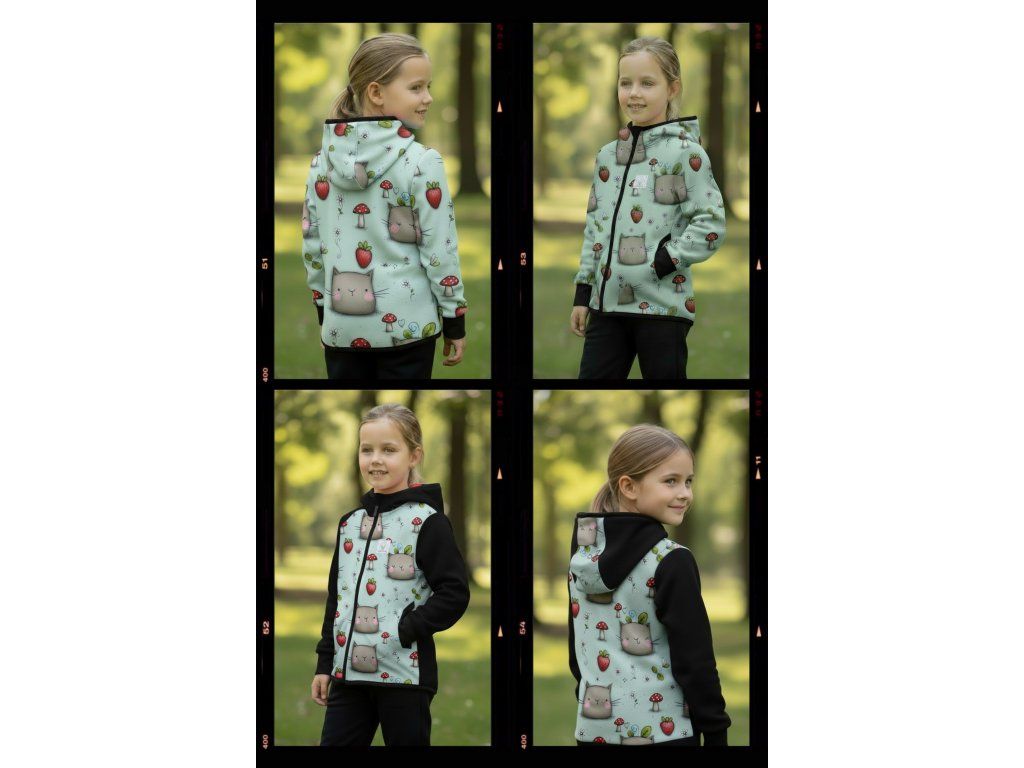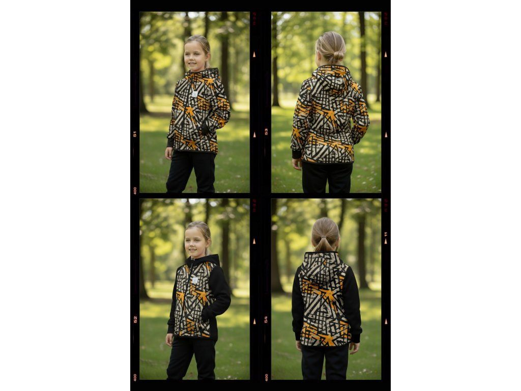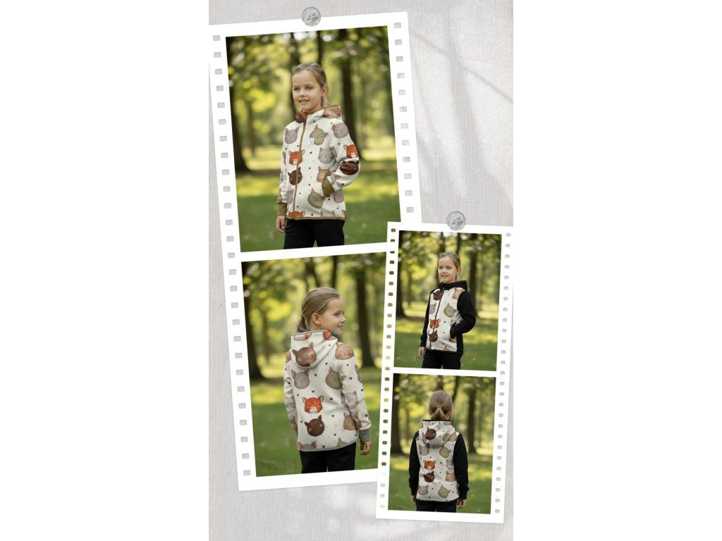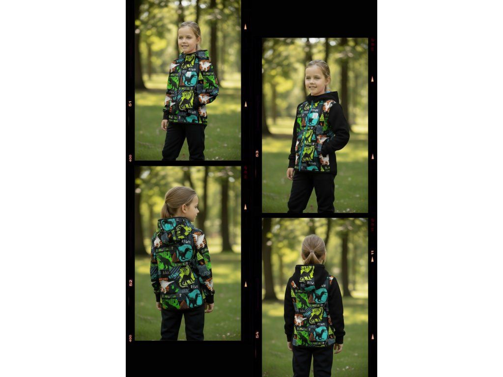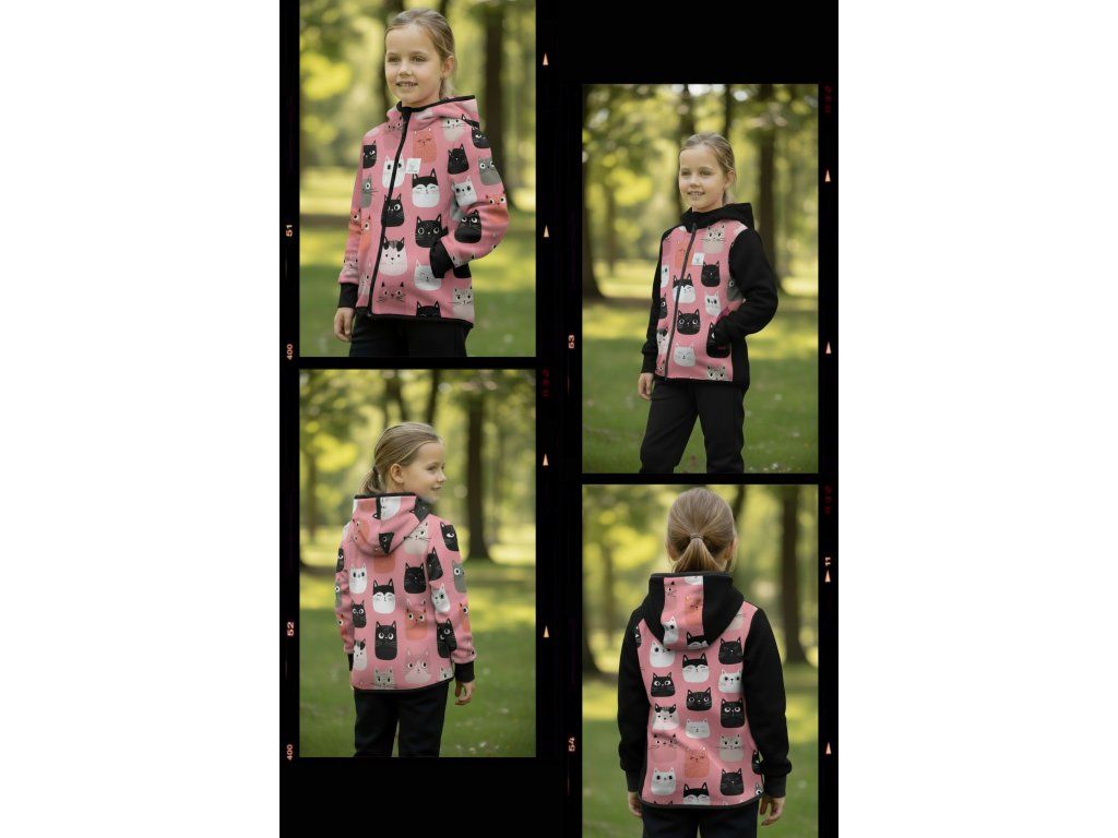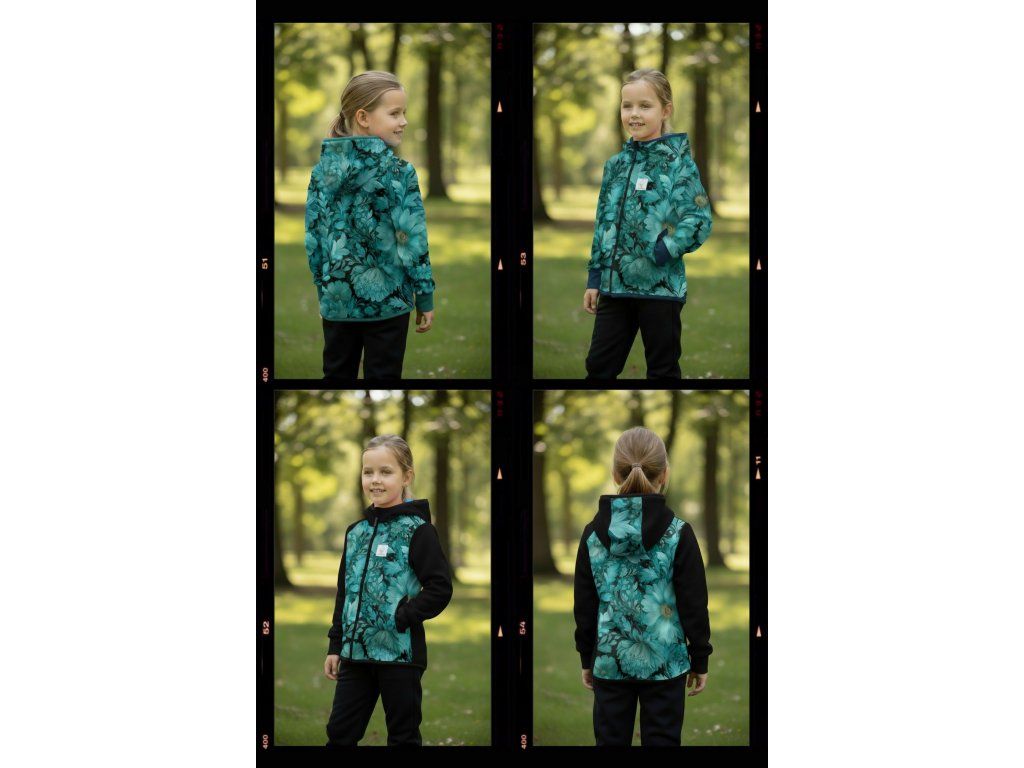 Bunda je ušitá z potištěného i jednobarevného softshellu, který má z rubu jemný flís, možno ušít i z letního softshellu, který z rubu nemá nic. Stačí připsat do poznámky k objednávce! Není problém se domluvit i na jiné barevné kombinaci.