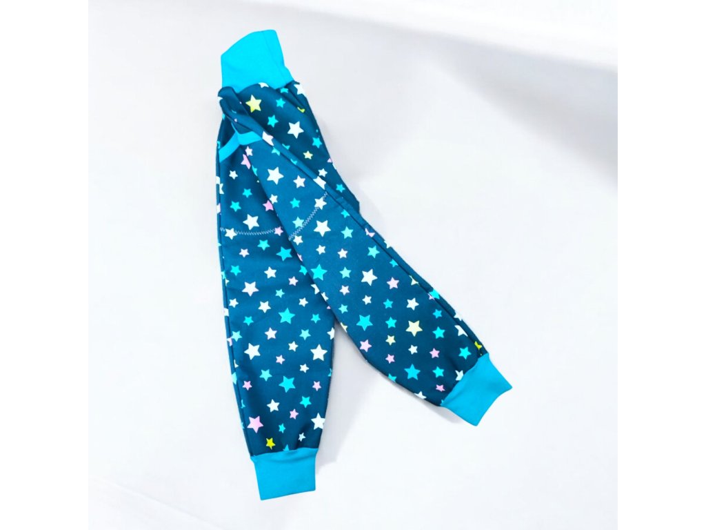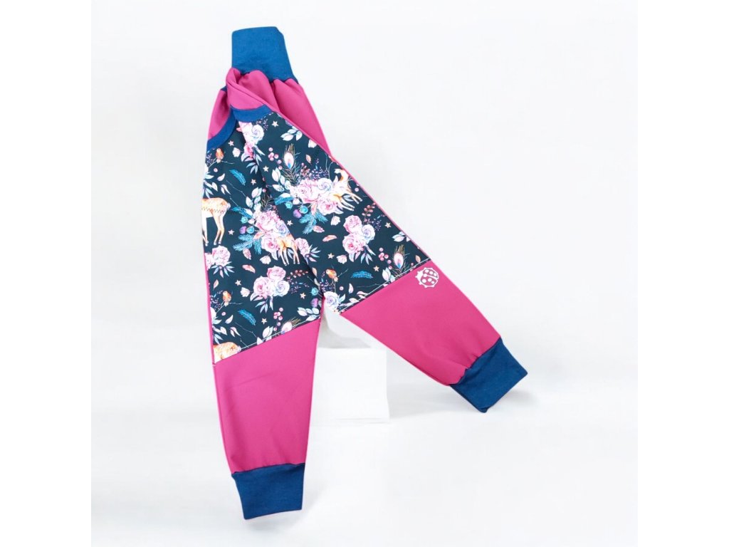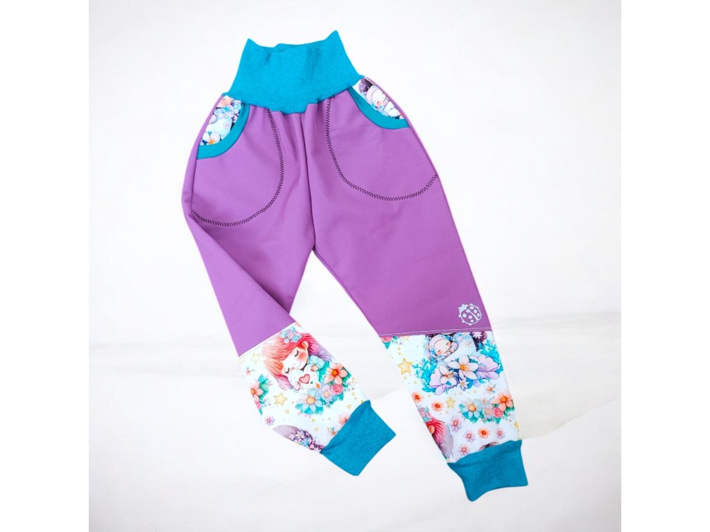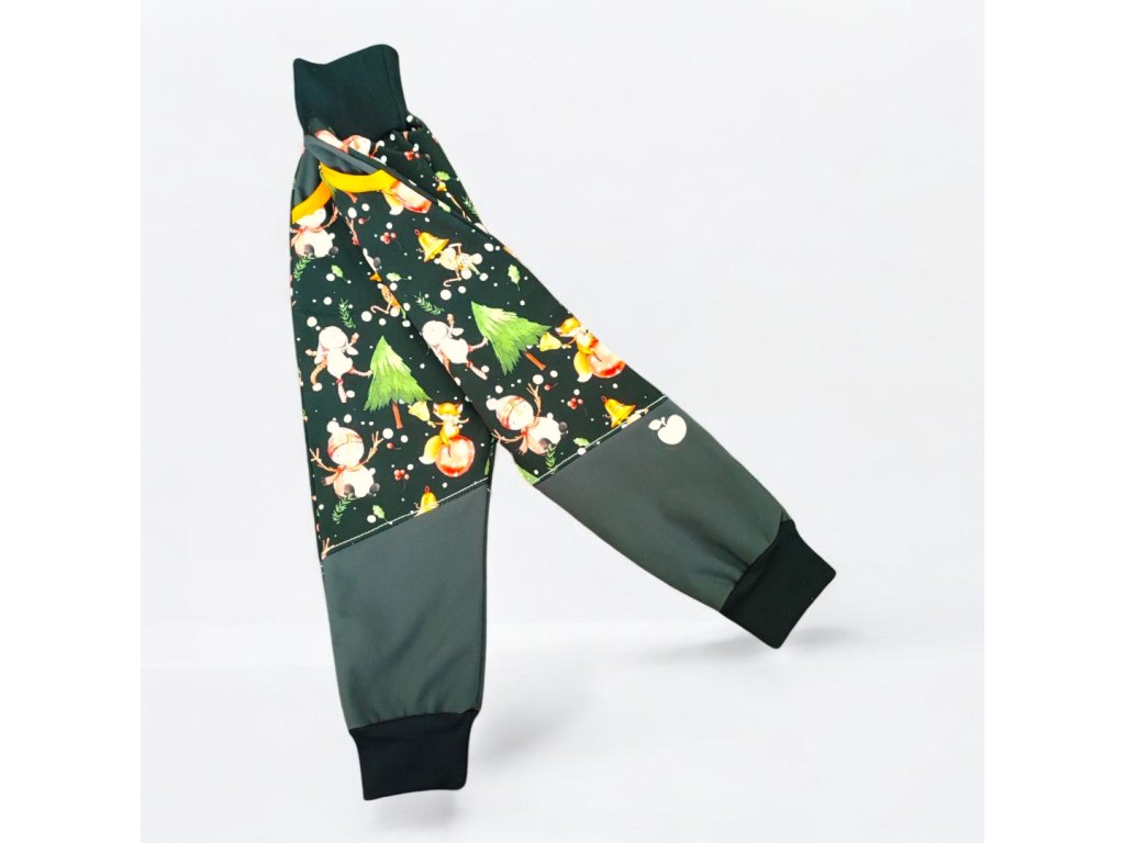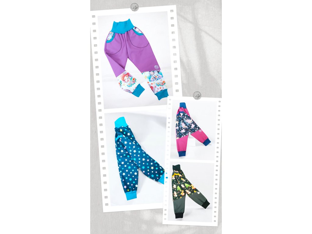 Kalhoty jsou ušité z potištěného i jednobarevného softshellu z rubu jemný fleece. Klasický střih, dvě boční kapsy, v pase do vyššího pružného nápletu s otvorem pro případné navlečení gumy, nohavice též zakončené pružným nápletem, rostoucí.