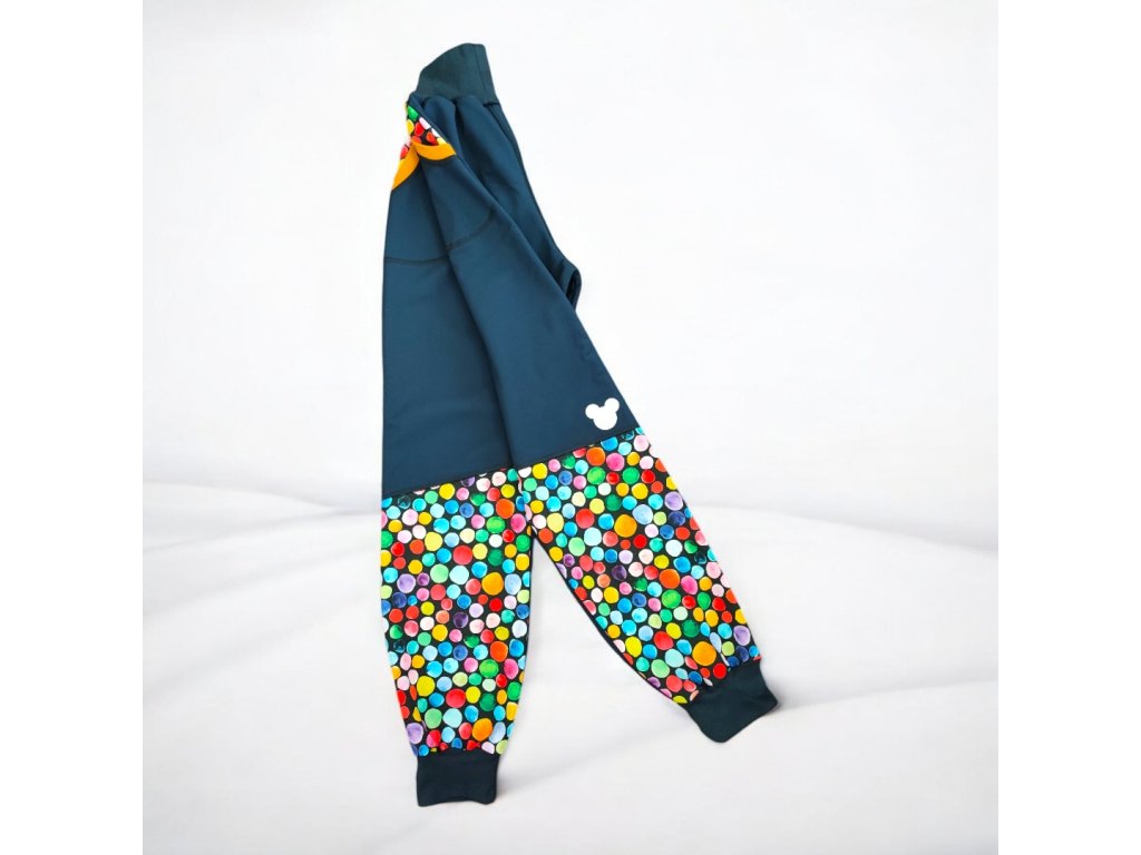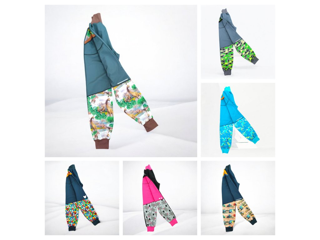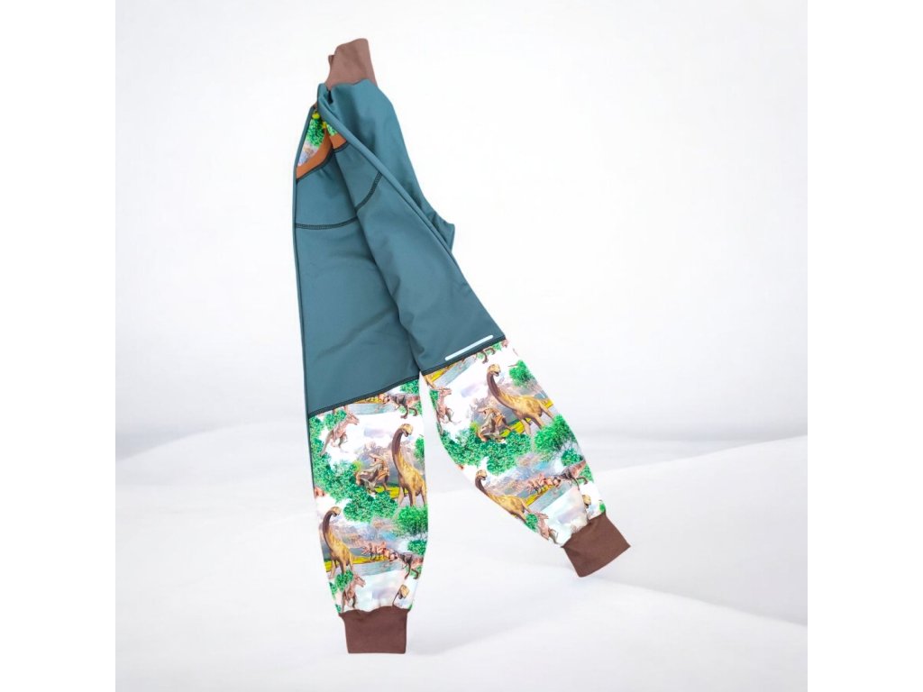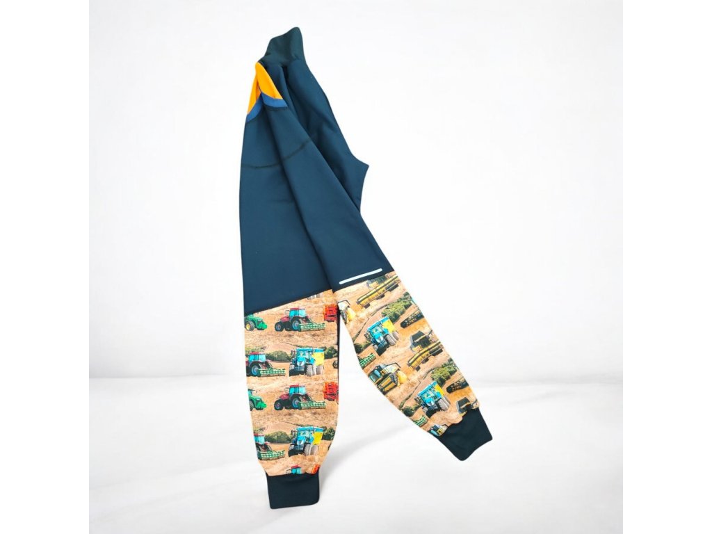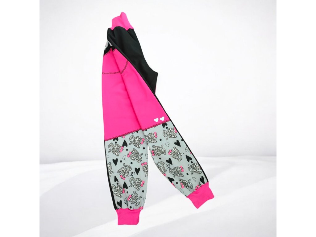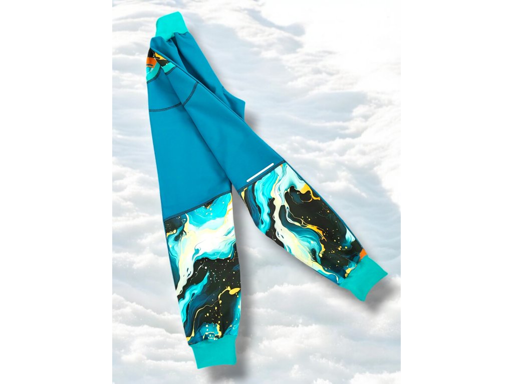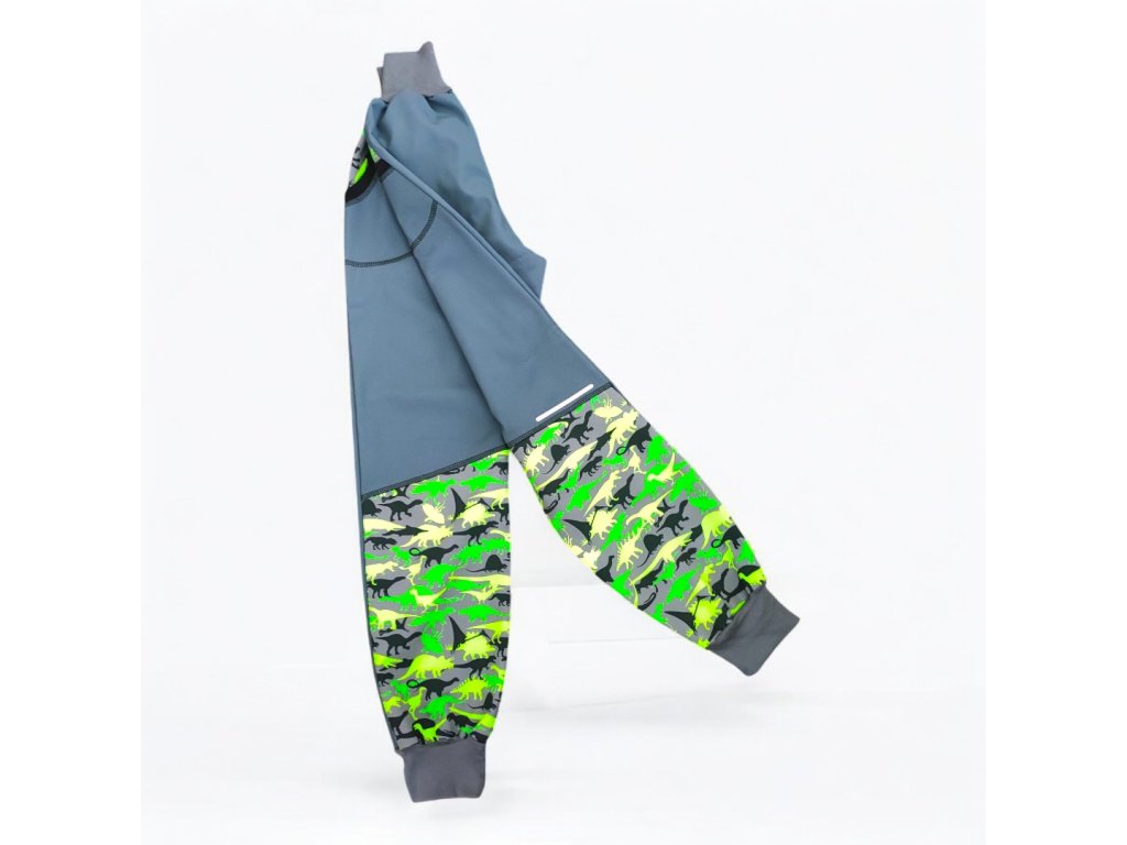 Kalhoty jsou ušité z potištěného i jednobarevného softshellu z rubu s jemným flísem. Klasický střih, dvě boční kapsy, v pase do vyššího pružného nápletu s otvorem pro případné navlečení gumy, nohavice též zakončené pružným nápletem, rostoucí.