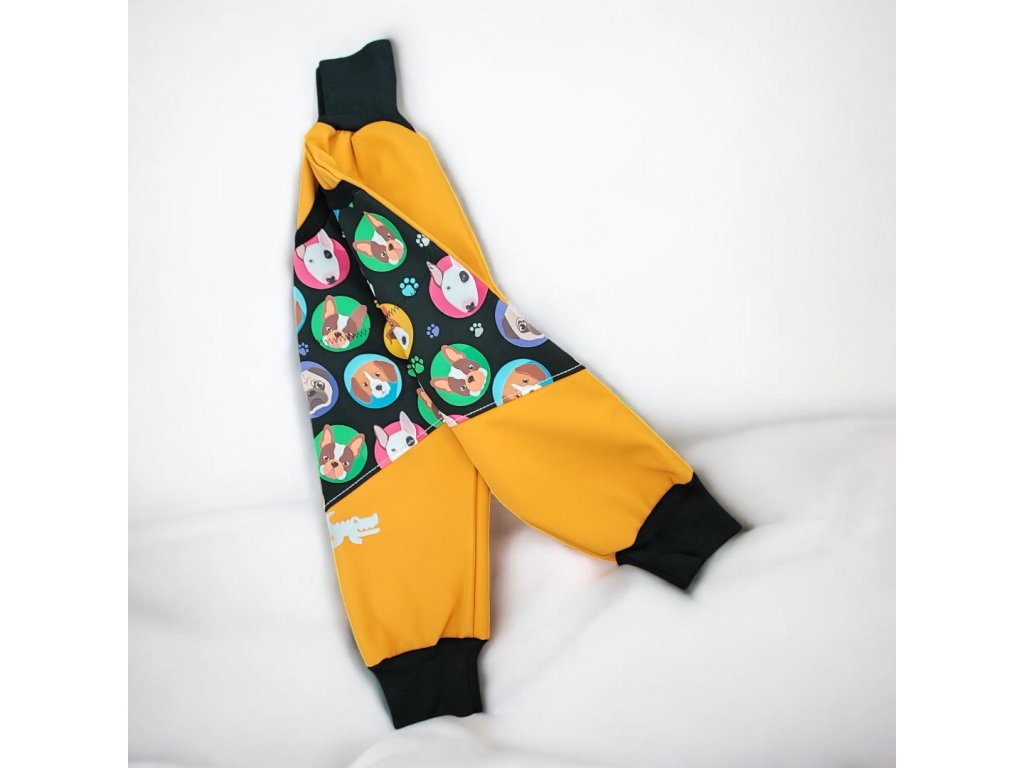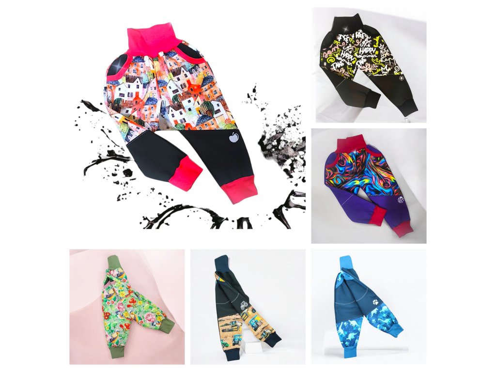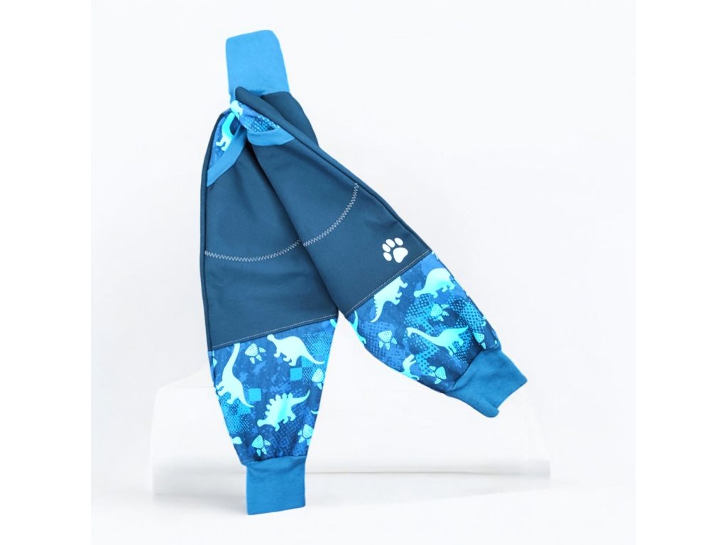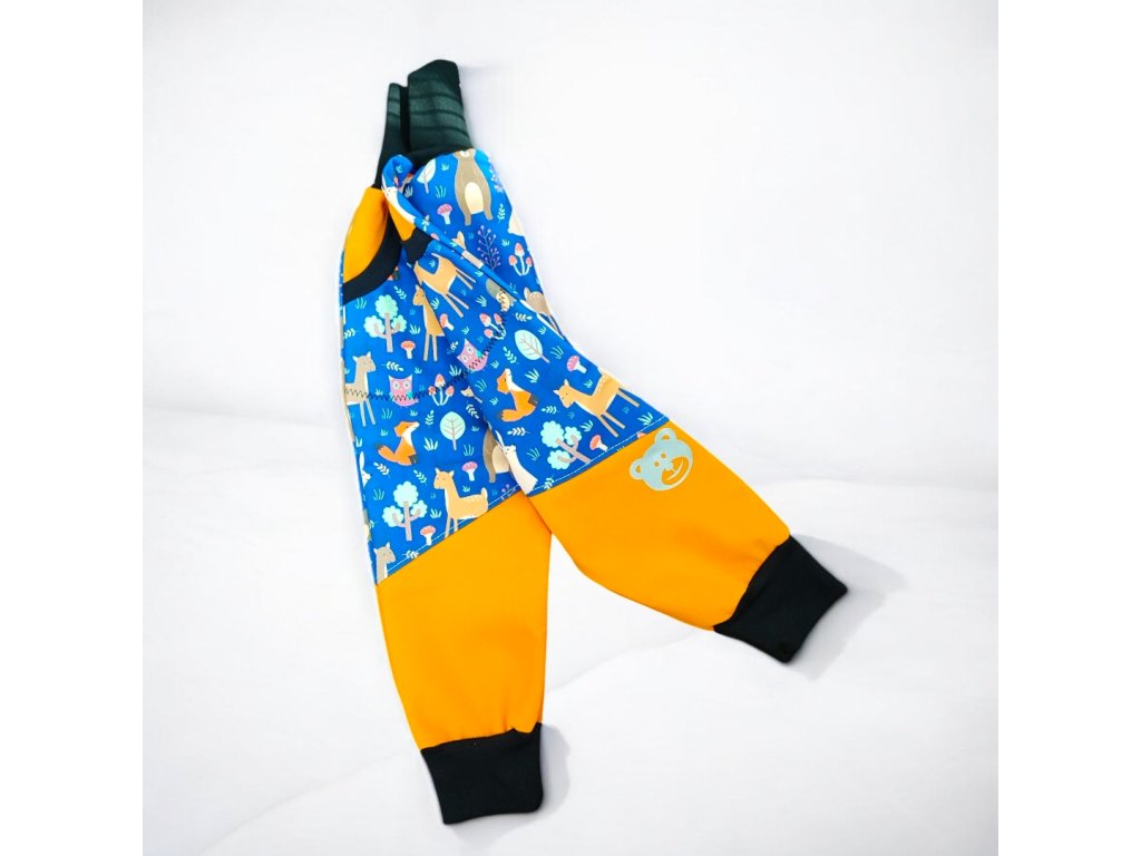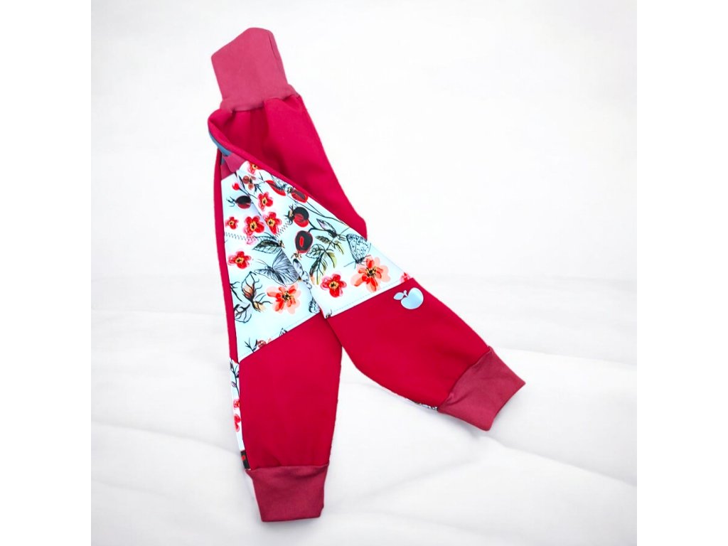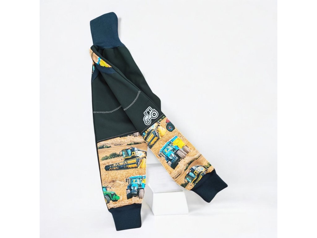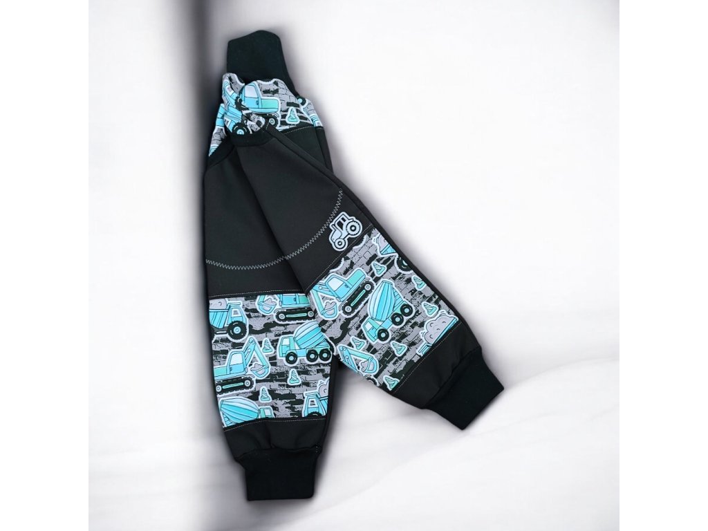 Kalhoty jsou ušité z potištěného i jednobarevného softshellu z rubu jemný fleece. Klasický střih, dvě boční kapsy, v pase do vyššího pružného nápletu s otvorem pro případné navlečení gumy, nohavice též zakončené pružným nápletem, rostoucí.