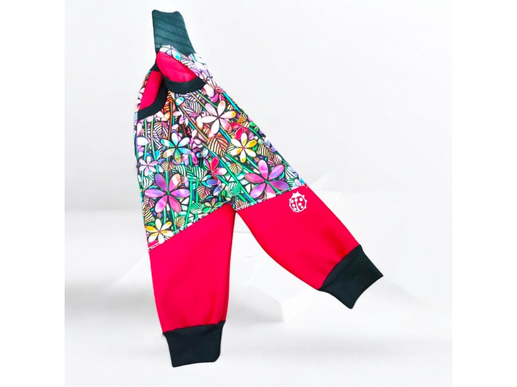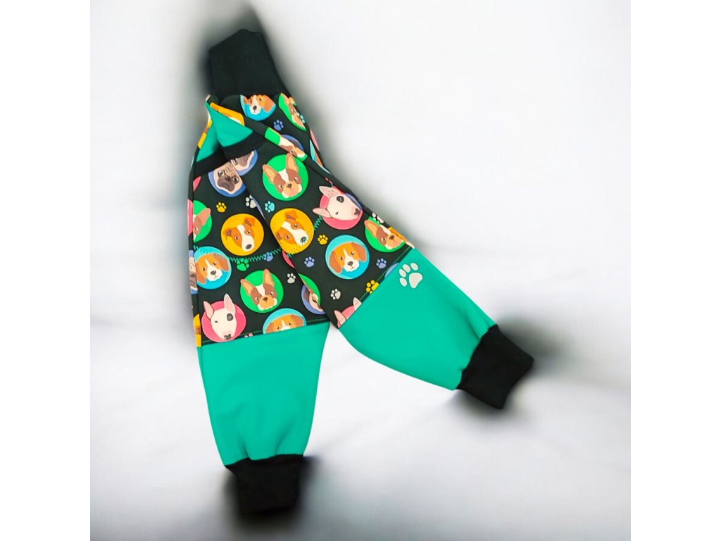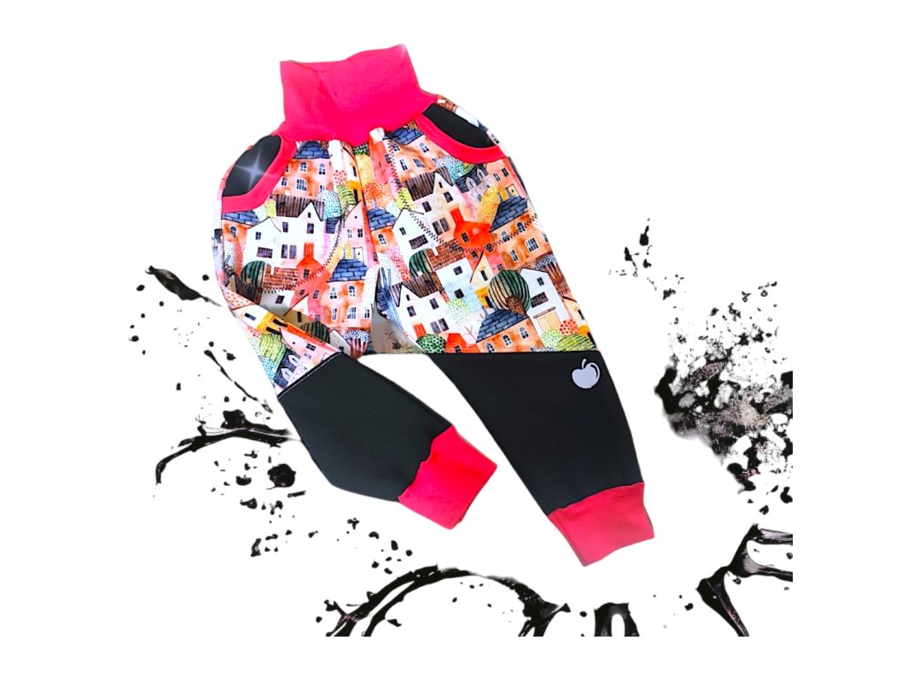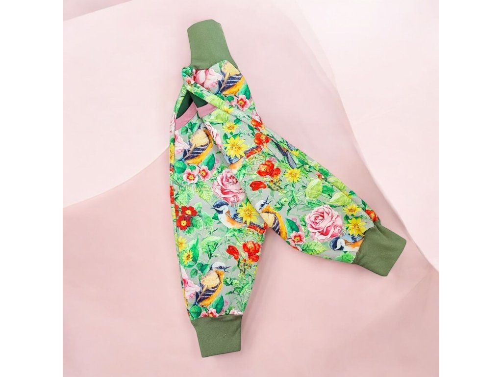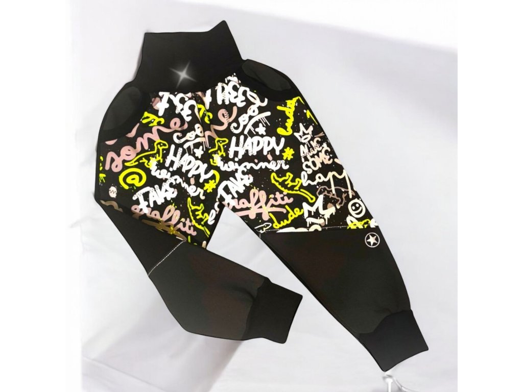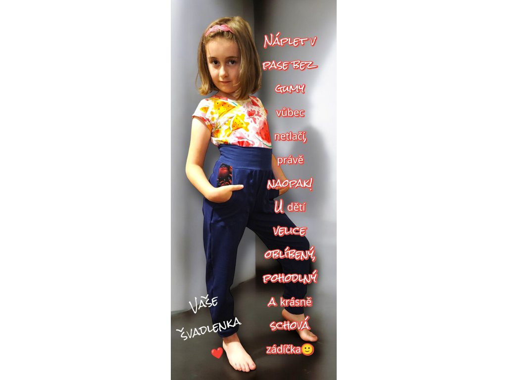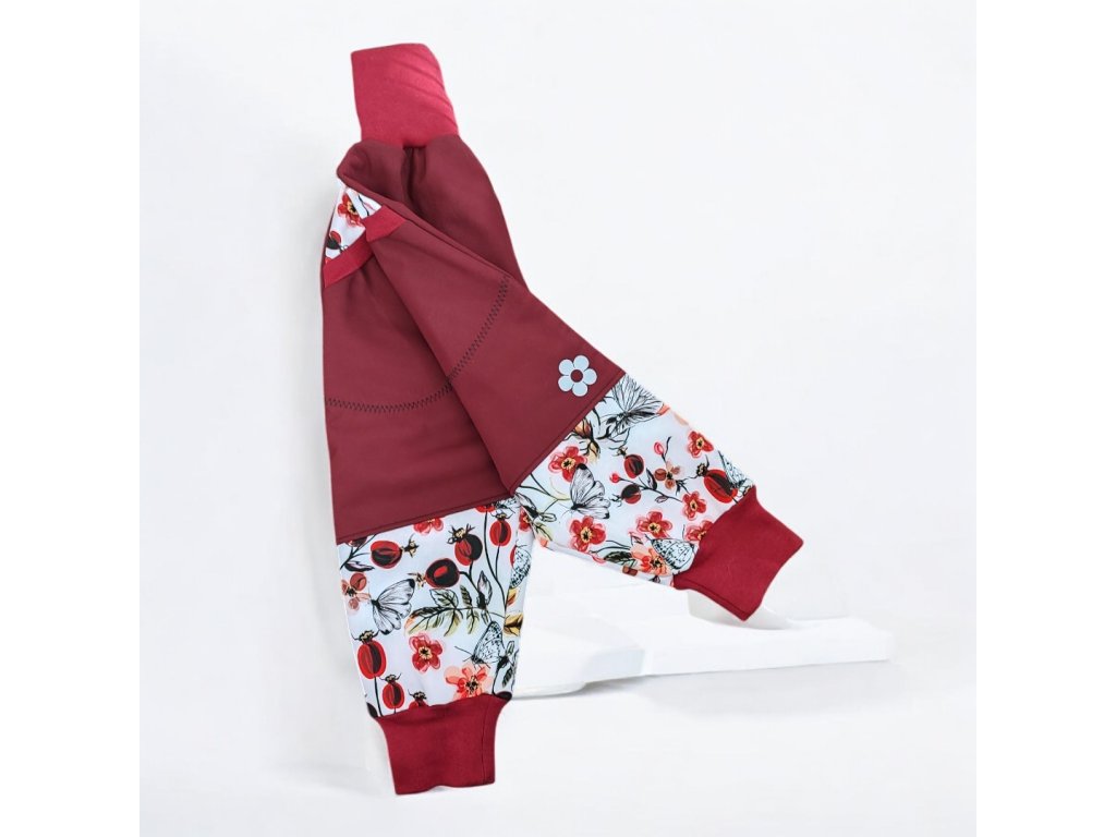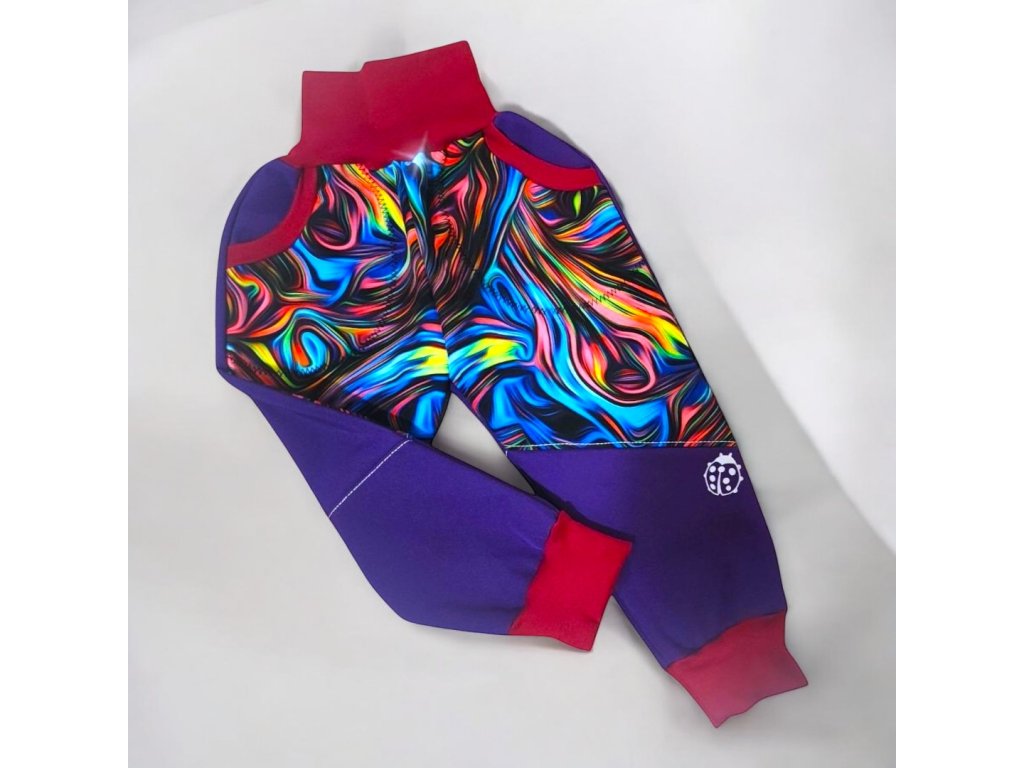 Kalhoty jsou ušité z potištěného i jednobarevného softshellu z rubu jemný fleece. Klasický střih, dvě boční kapsy, v pase do vyššího pružného nápletu s otvorem pro případné navlečení gumy, nohavice též zakončené pružným nápletem, rostoucí.