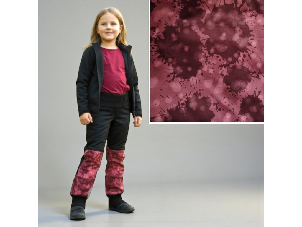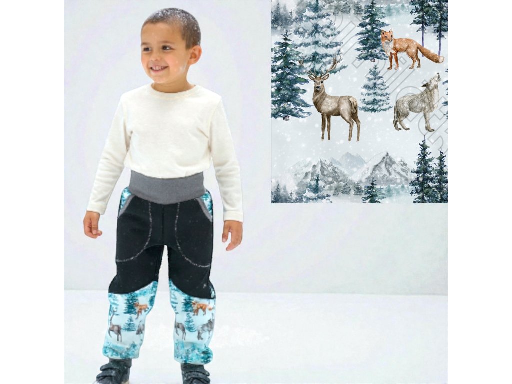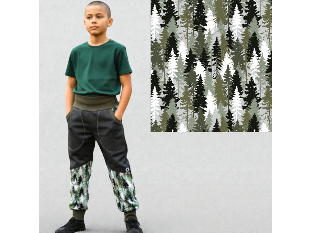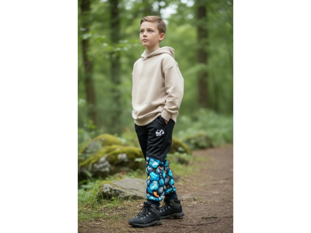 Kalhoty jsou ušité z potištěného i jednobarevného softshellu, z rubu jemný fleece. Kalhoty jsou klasické, dvě boční kapsy, v pase do vyššího pružného nápletu s otvorem pro případné navlečení gumy, nohavice též zakončené pružným nápletem (rostoucí). Reflexní prvky součástí.
