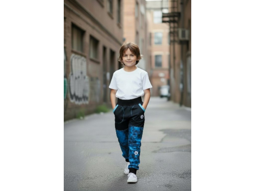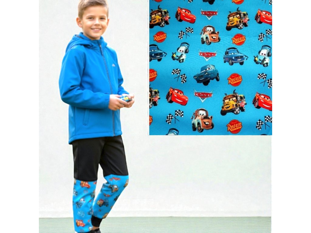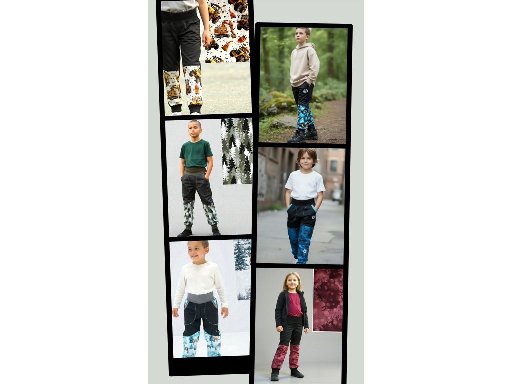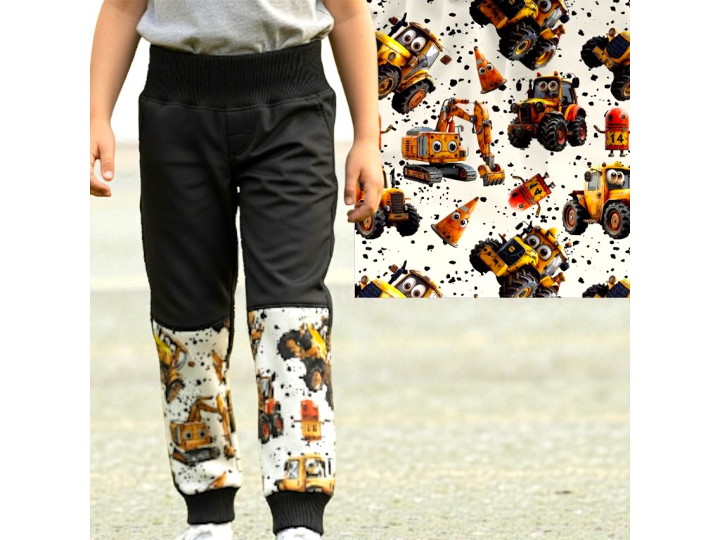Kalhoty jsou ušité z potištěného i jednobarevného softshellu, z rubu jemný fleece. Kalhoty jsou klasické, dvě boční kapsy, v pase do vyššího pružného nápletu s otvorem pro případné navlečení gumy, nohavice též zakončené pružným nápletem (rostoucí). Reflexní prvky součástí.