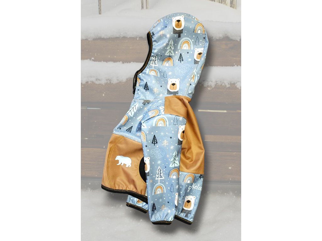 Souprava je ušitá z jednobarevného i potištěného softshellu, který má z rubu hřejivého beránka. Je funkční, odolná vůči vodě a větru a zároveň prodyšná. Bunda je na zip s krytem, dvě boční kapsy, kapuce, zadní díl je mírně prodloužený, reflexní prvky součástí. Kalhoty jsou klasické, dvě kapsy, v pase do vyššího pružného nápletu s otvorem pro případné navlečení gumy, nohavice též zakončené pružným nápletem (rostoucí).