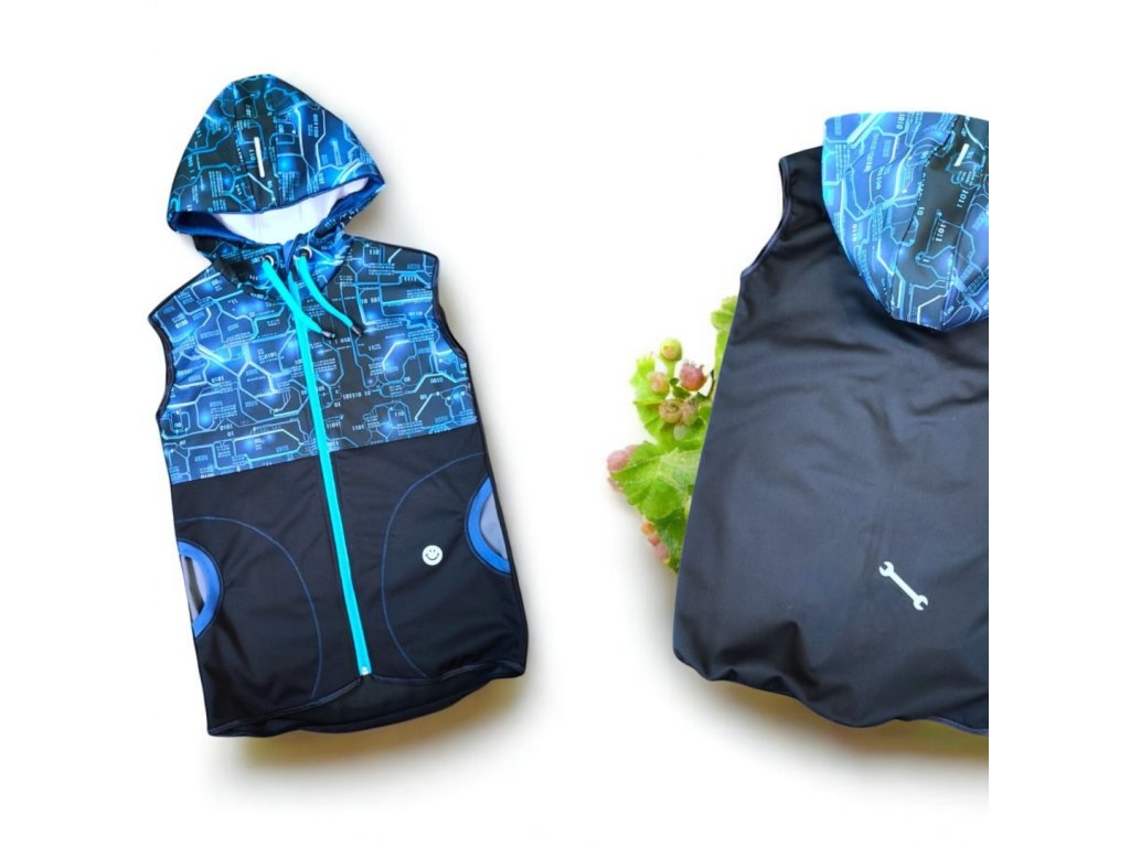 Vesta je šitá z jednobarevného i potištěného softu s flísem materiál je pružný do stran. Vesta je na zip s kapucí, kterou můžete dle potřeby stáhnout olivkou. Má dvě boční kapsy, kryt zipu a reflexní prvky. Prodloužený zadní díl.