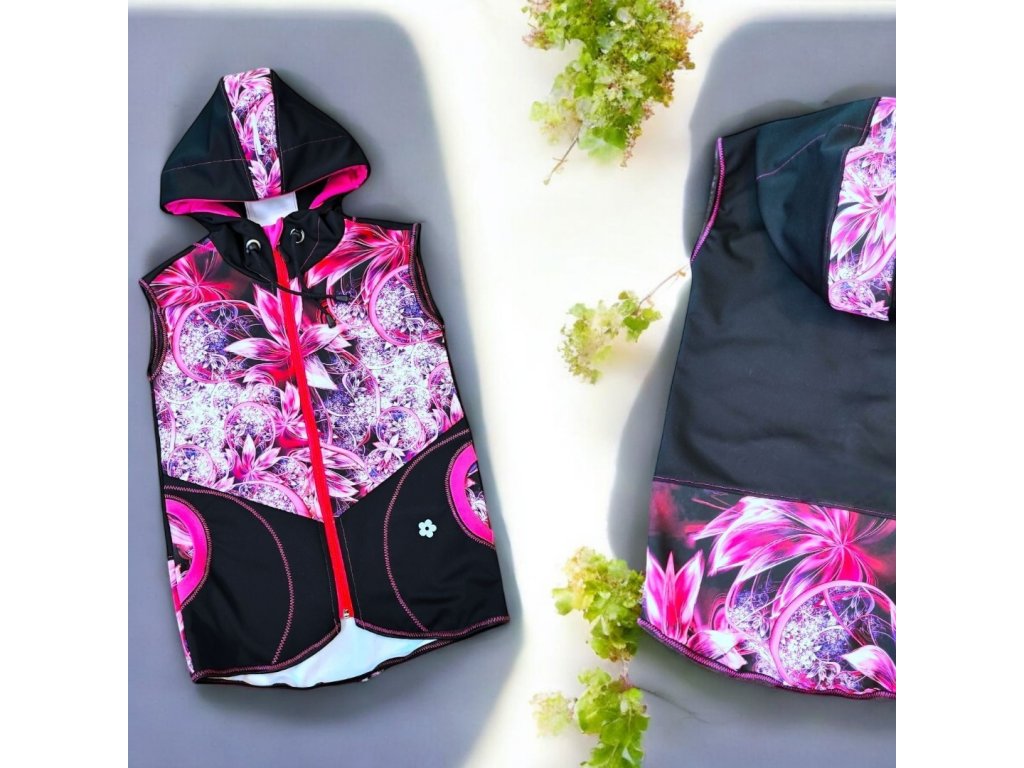Softshell vesta růžové květy na černé 110/116 Holčičí vesta
