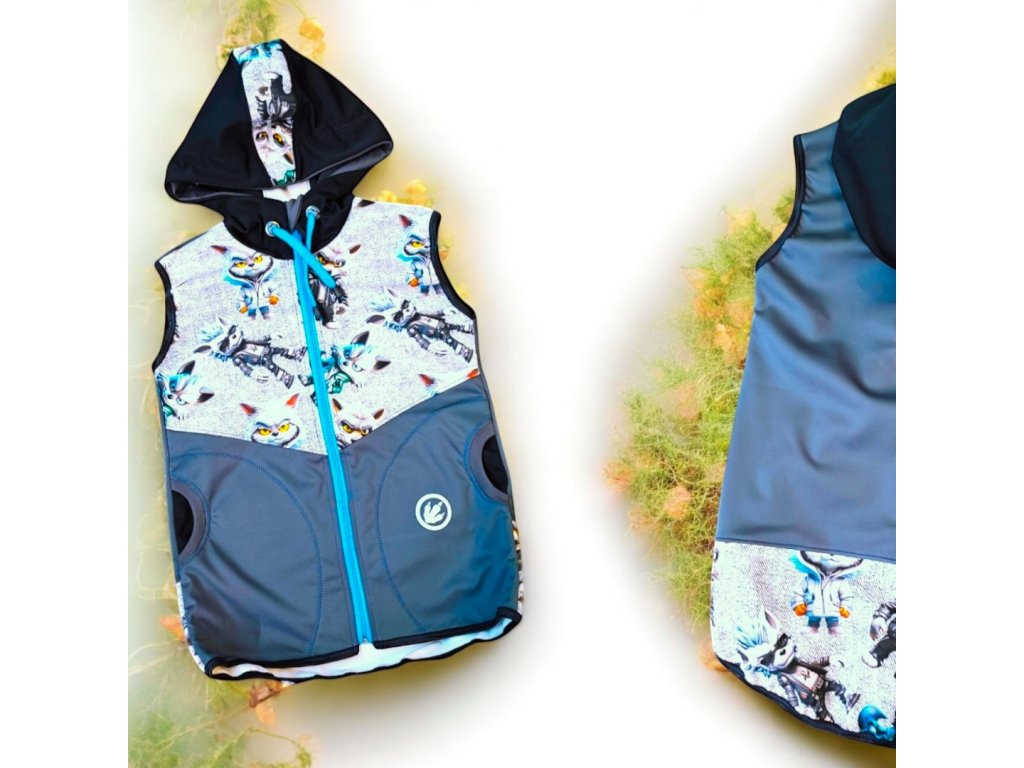 Vesta je šitá z jednobarevného i potištěného softu s flísem materiál je pružný do stran. Vesta je na zip s kapucí, kterou můžete dle potřeby stáhnout olivkou. Má dvě boční kapsy, kryt zipu a reflexní prvky. Prodloužený zadní díl.