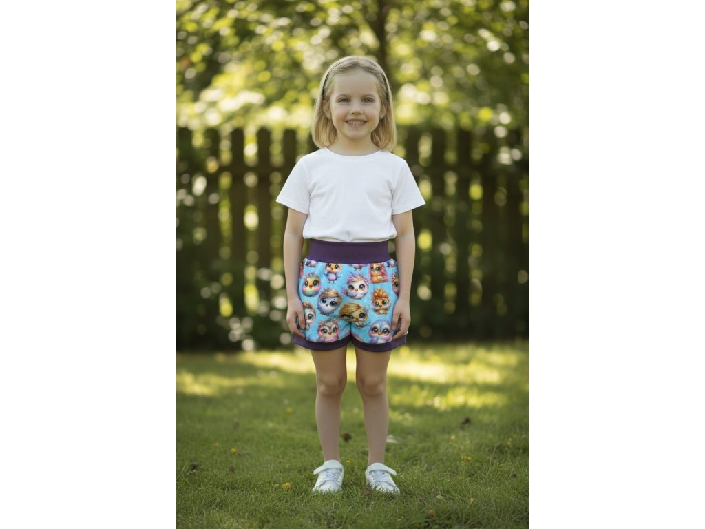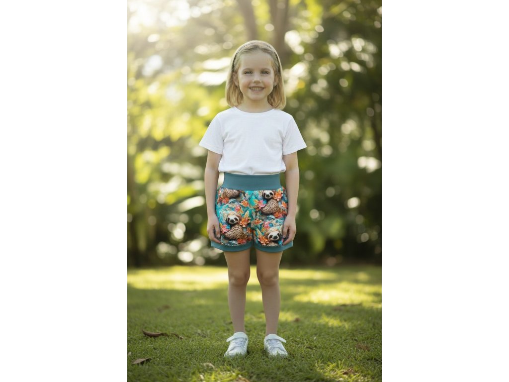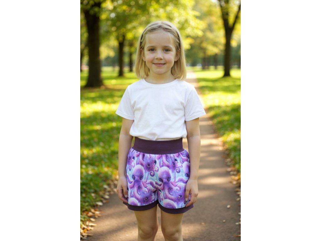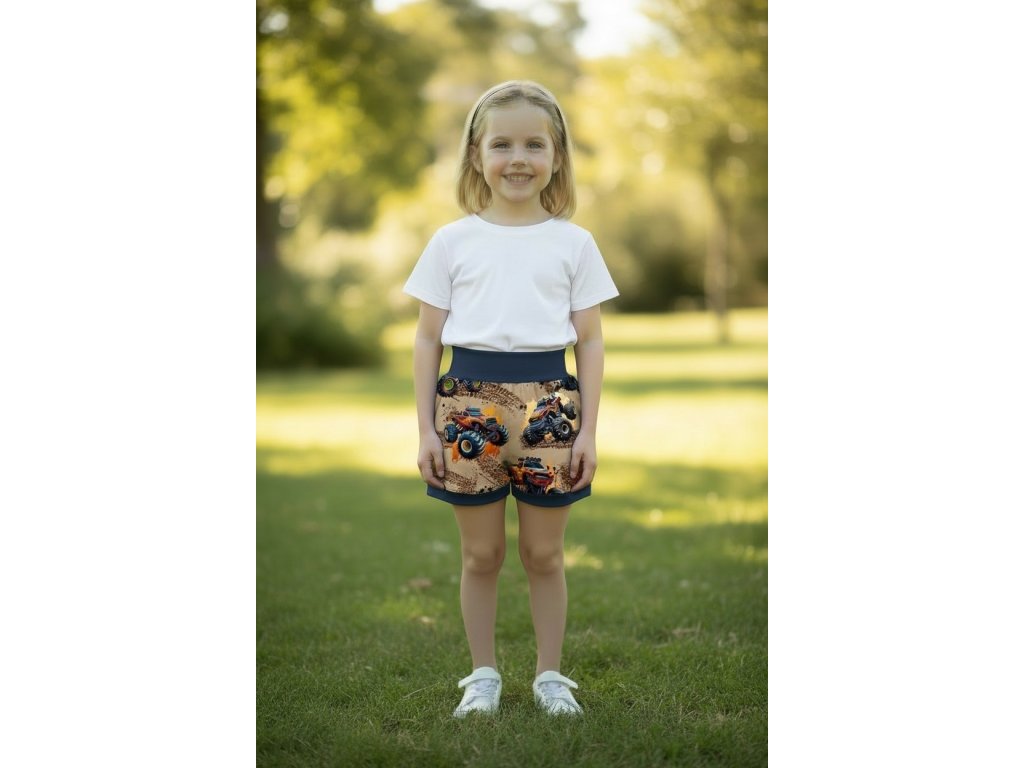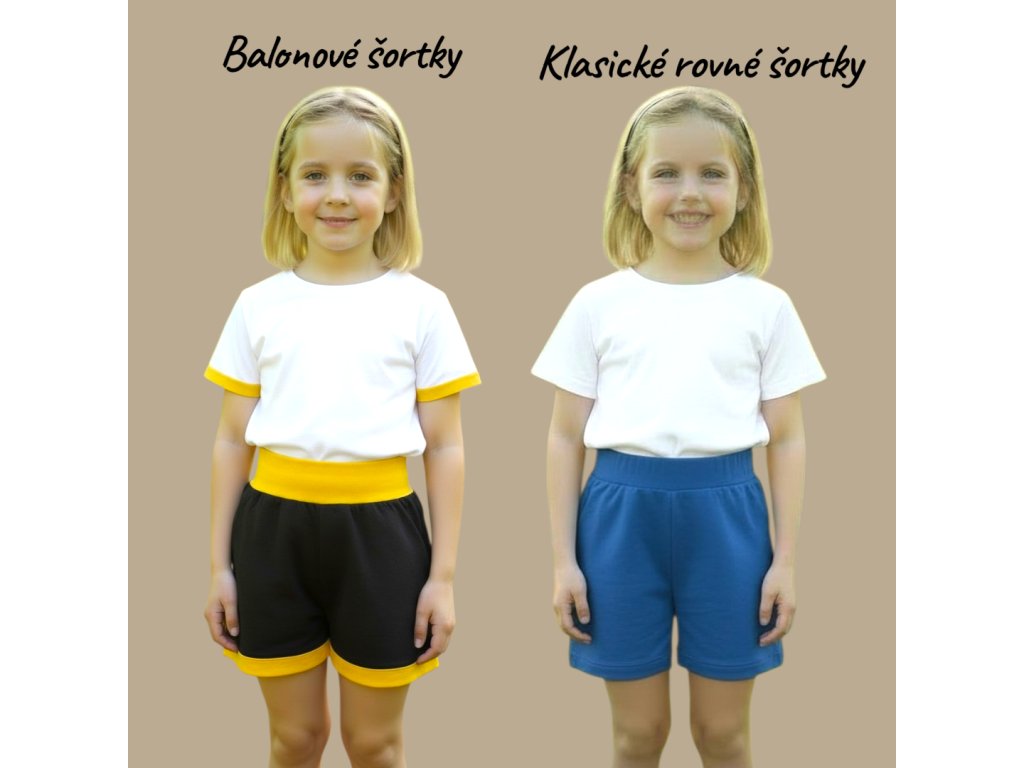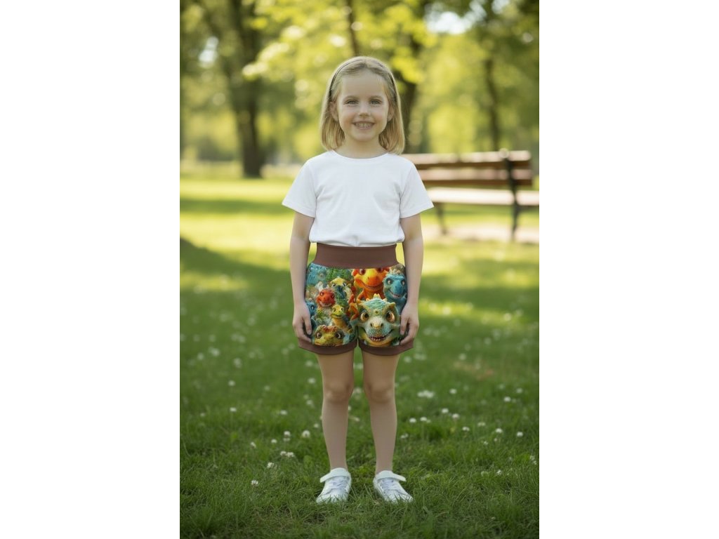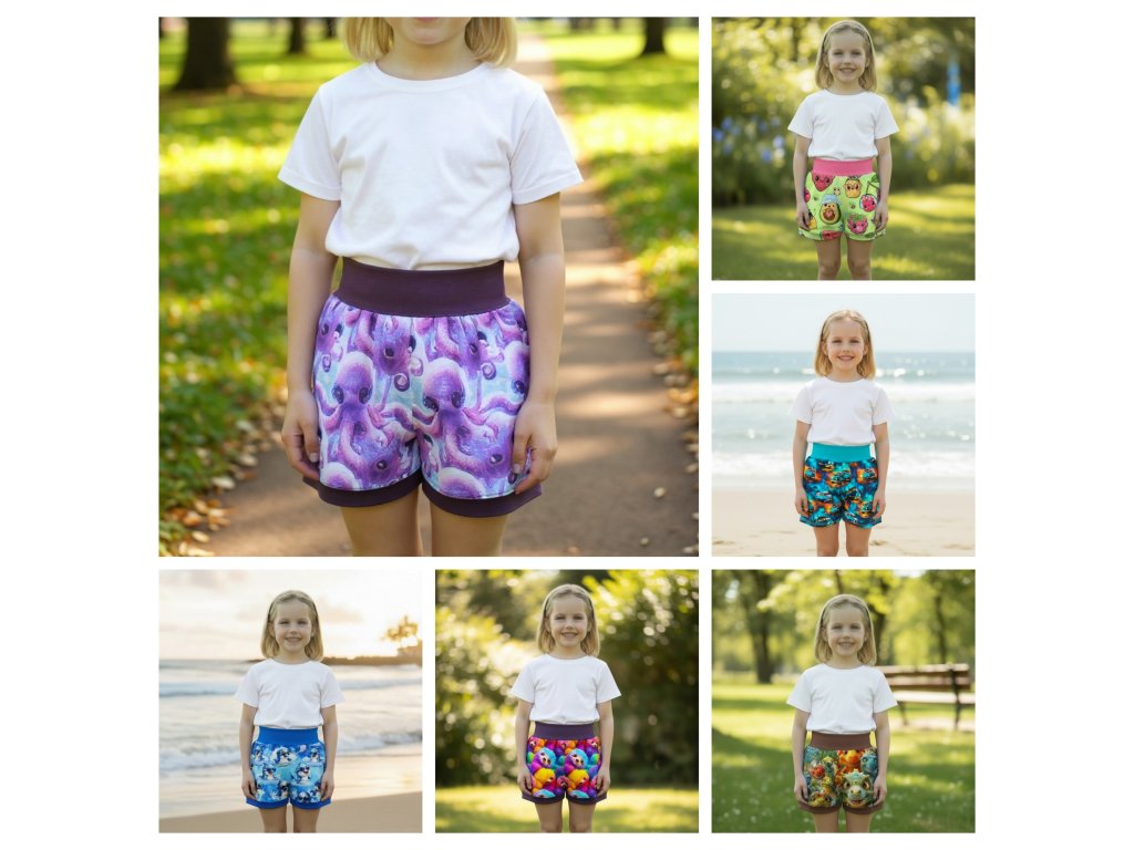 Šortky jsou ušité z potištěného úpletu. V pase do vyššího pružného nápletu s otvorem pro případné navlečení gumy. Výběr ze dvou střihů, balónový a klasický rovný. Vhodné pro kluky i holky, v různých velikostech a motivech.